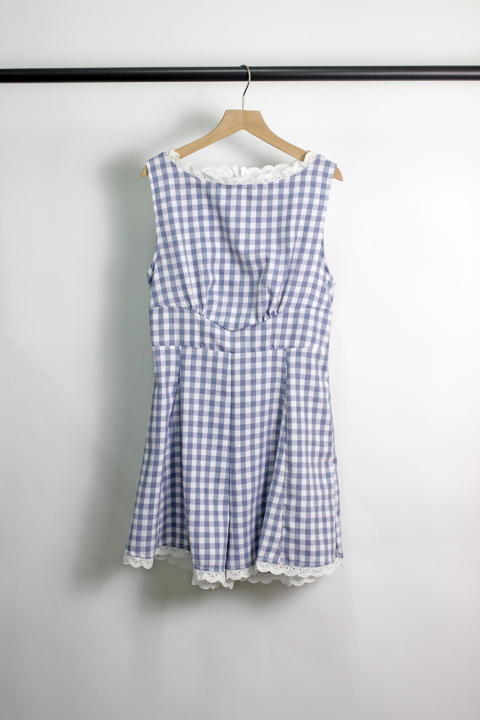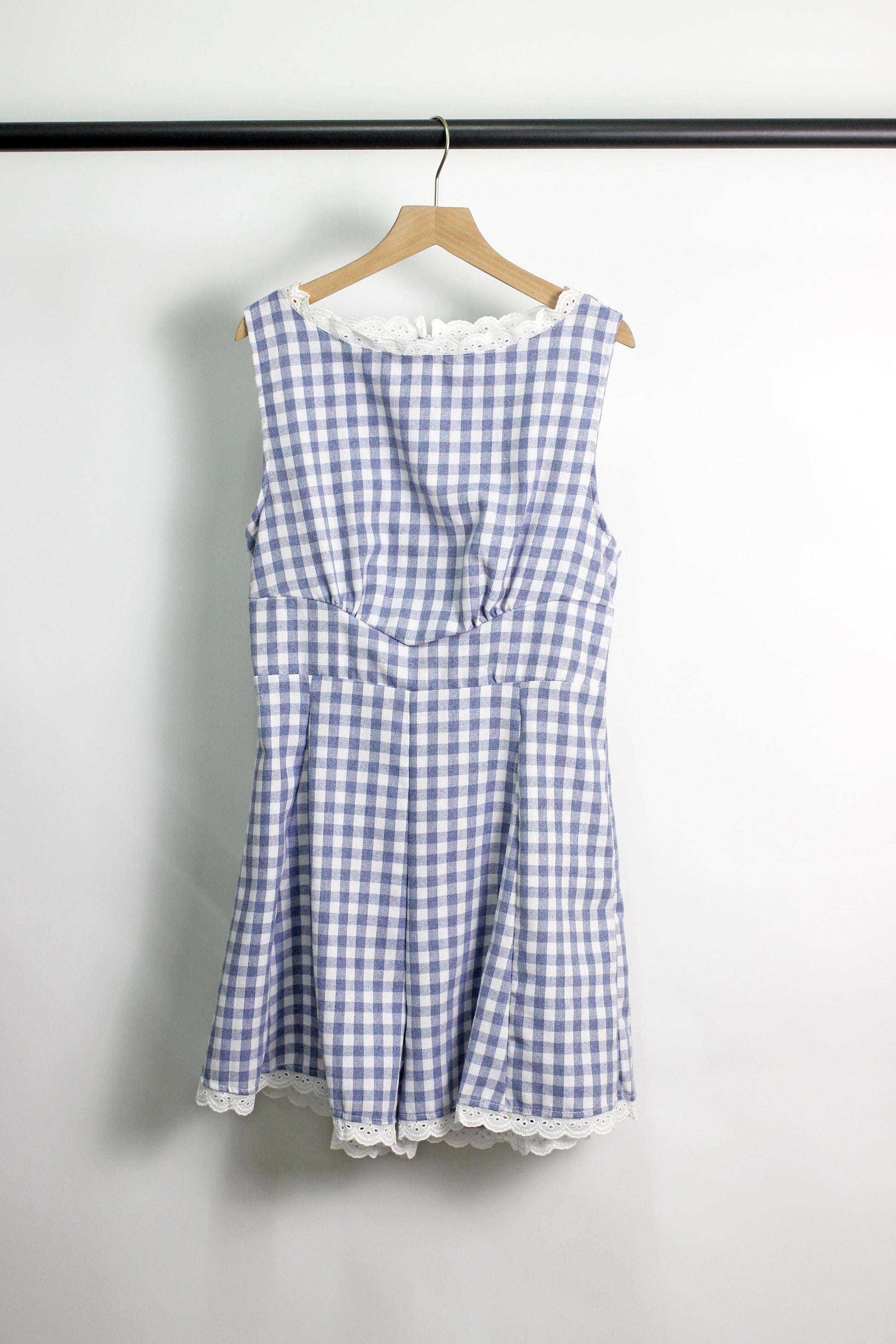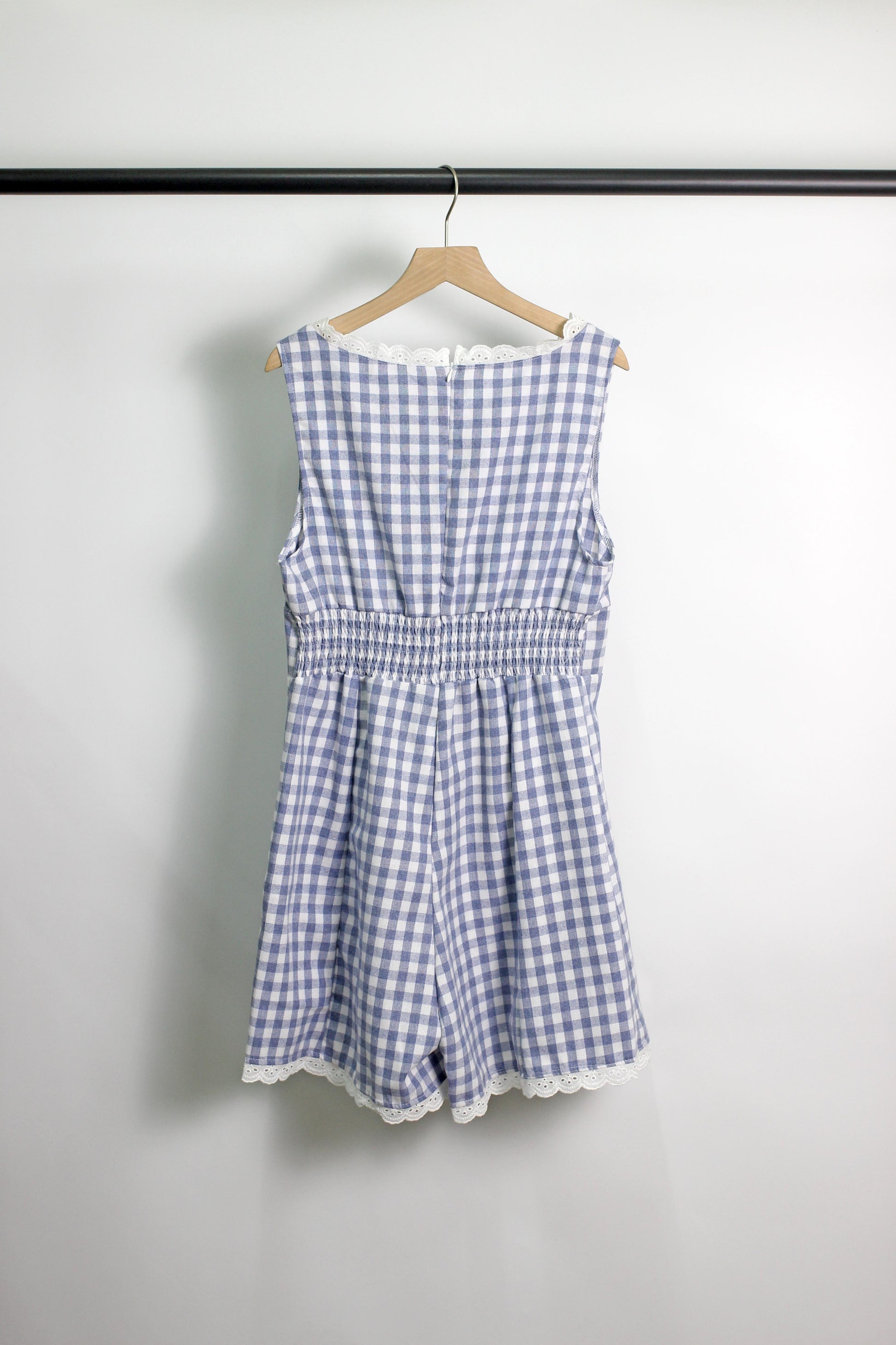 This vintage-inspired gingham romper is the perfect blend of retro charm and modern comfort. Designed with a classic blue and white checkered pattern, it features delicate lace trim detailing along the neckline and hem, adding a touch of femininity. The sleeveless design and lightweight fabric make it ideal for summer outings, casual wear, or picnics. With a smocked waist for a flattering fit, this romper ensures both style and comfort. The back zipper closure allows for easy wear, while the flowy silhouette provides a relaxed yet chic aesthetic.