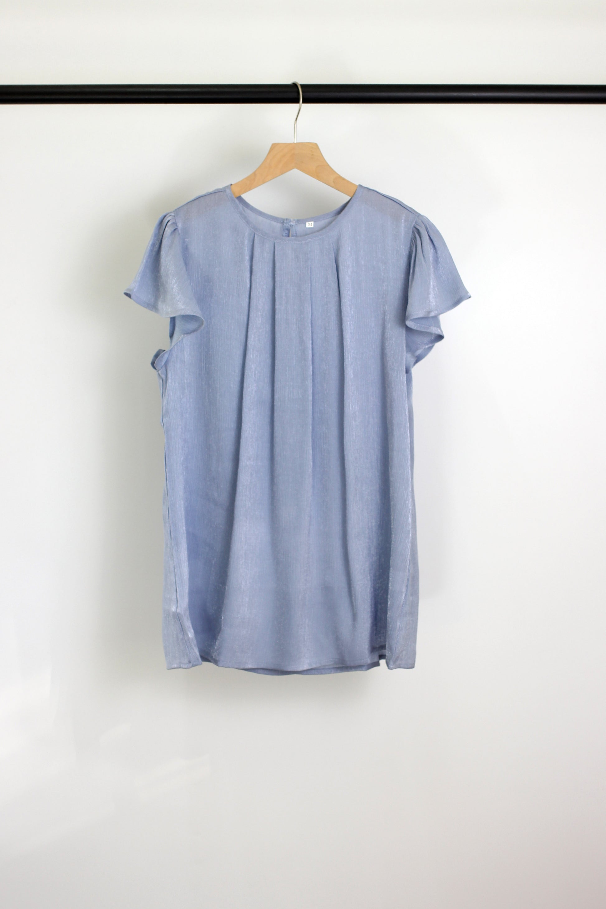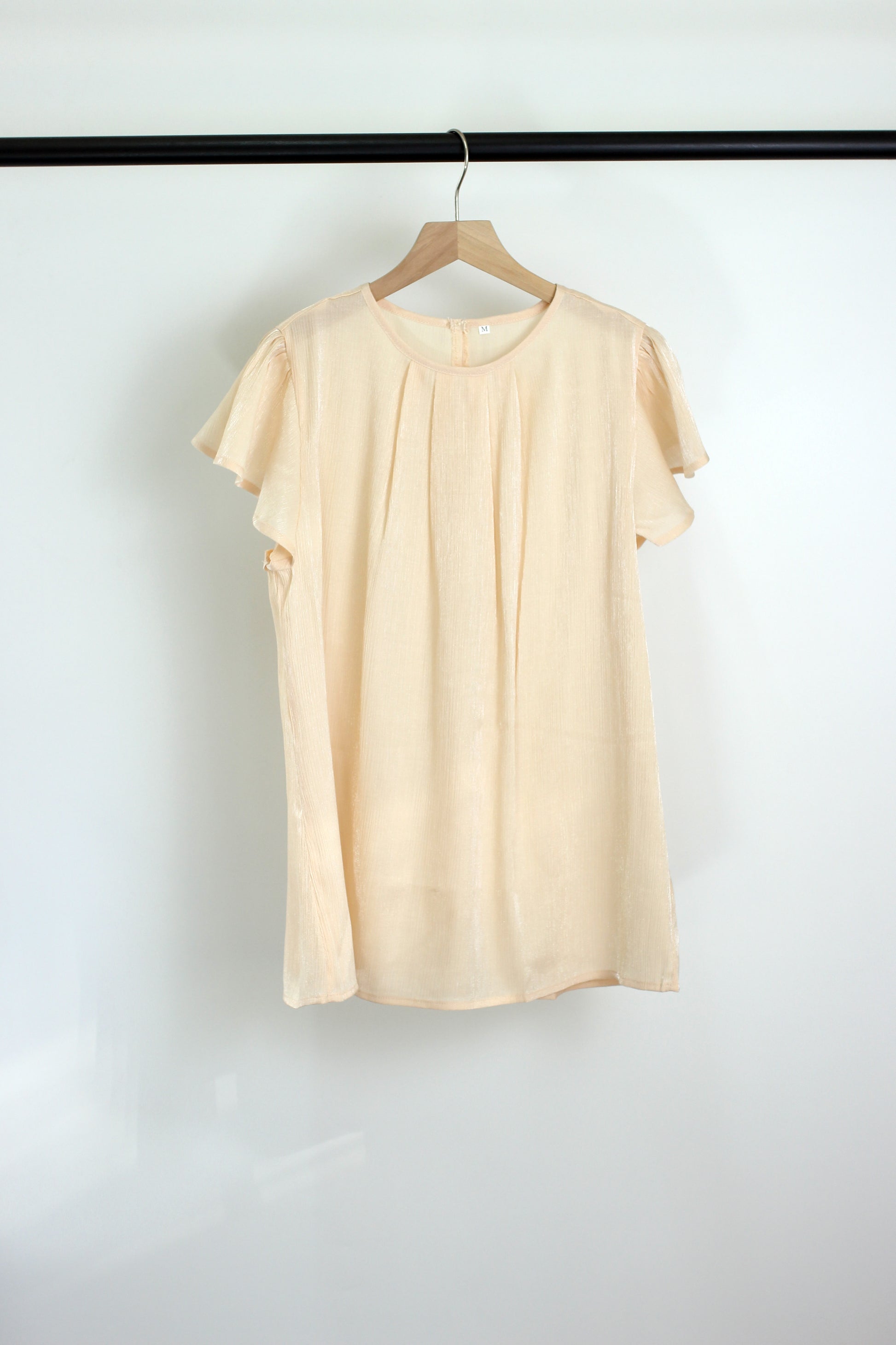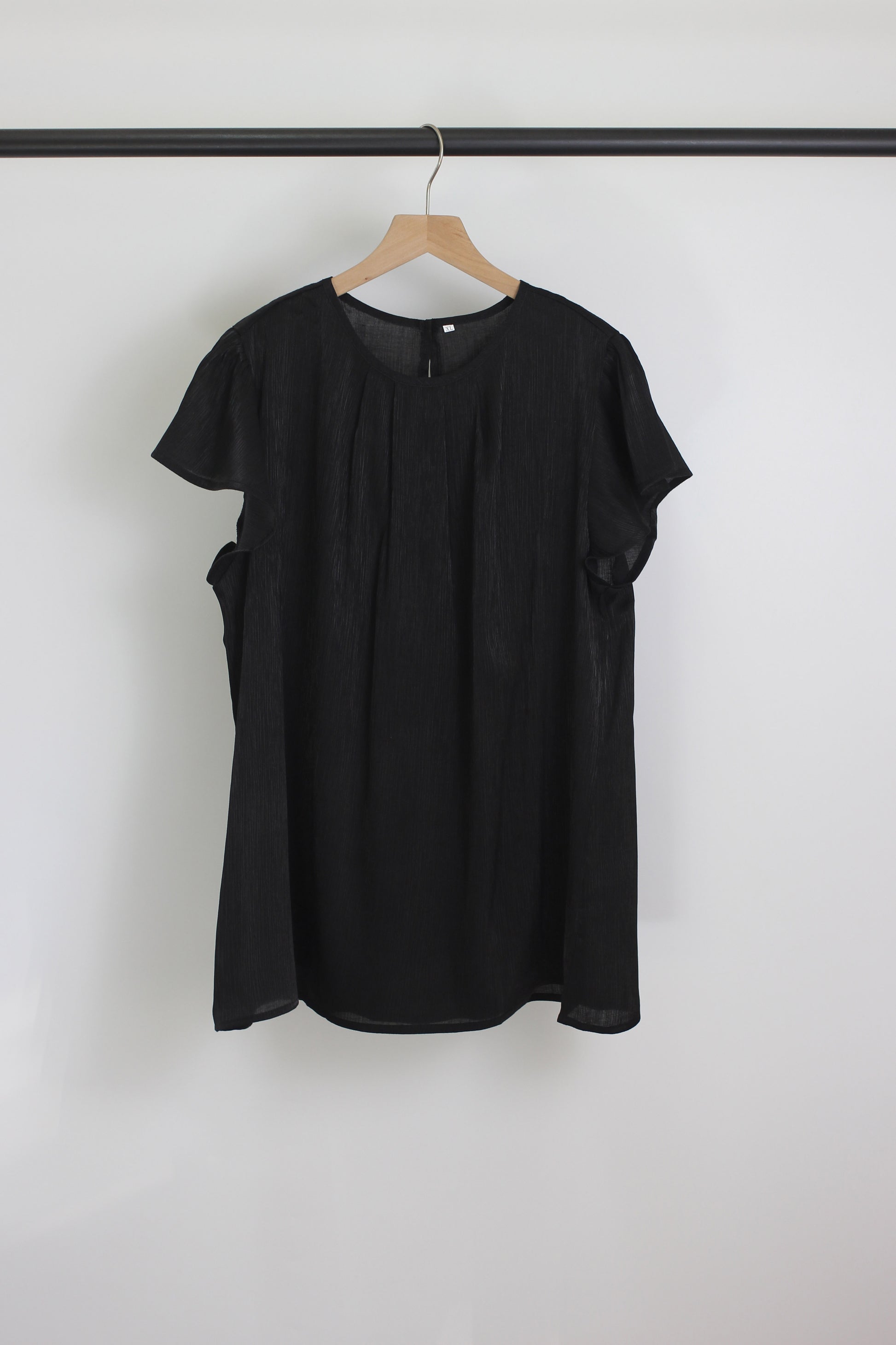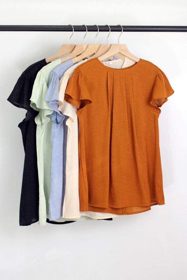 The loose fit and soft fabric will have you feeling like you're floating on clouds. This top features round neckline, back k-hole with button closure, pleated front detail, ruffle short sleeve.