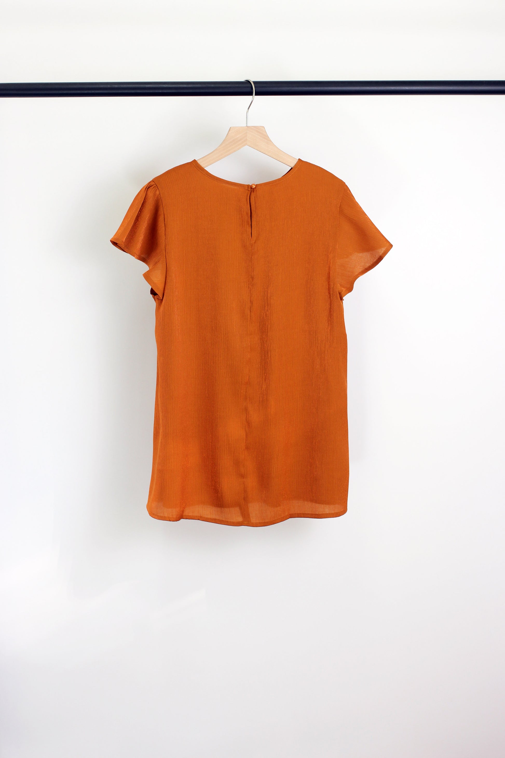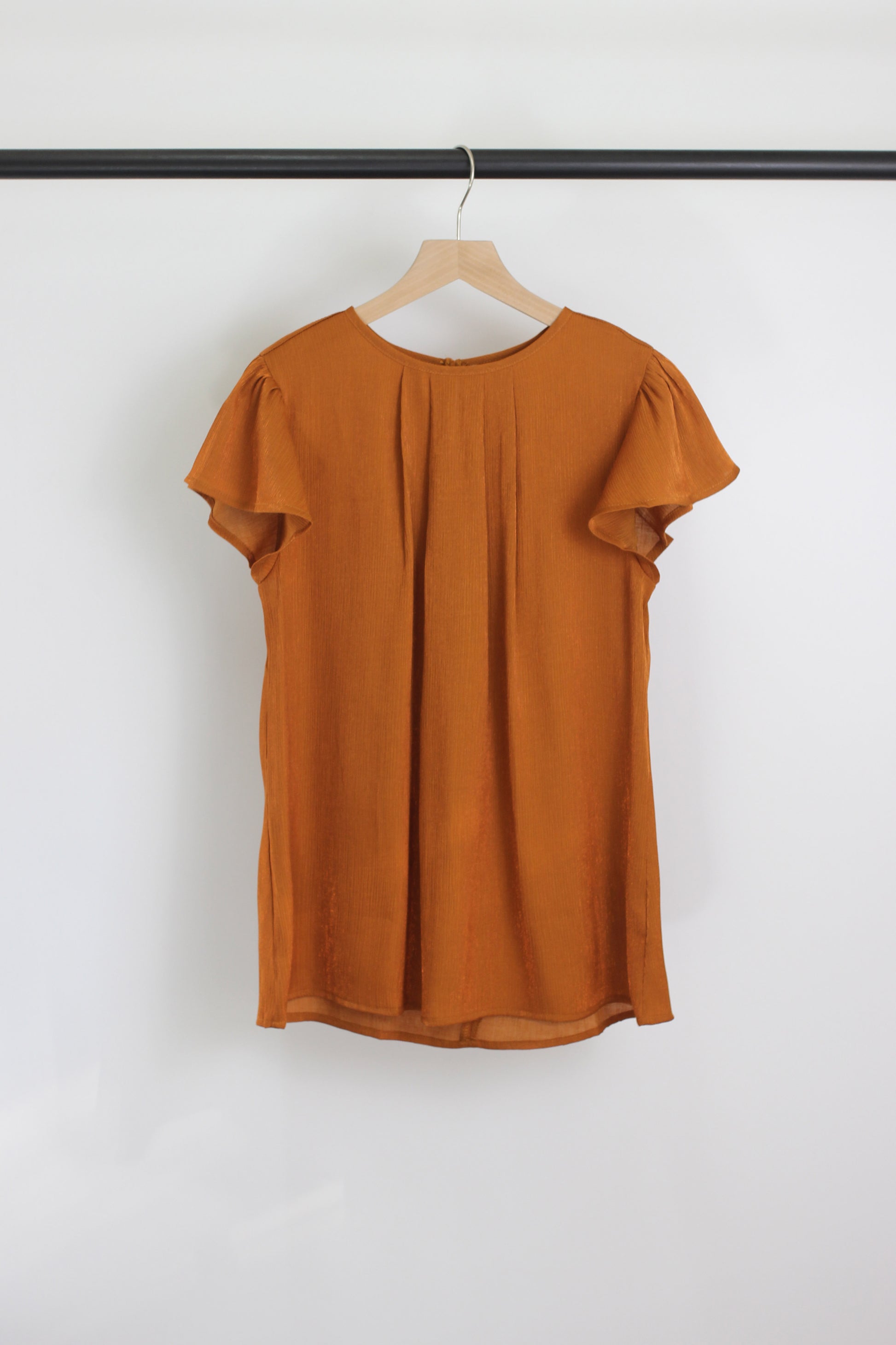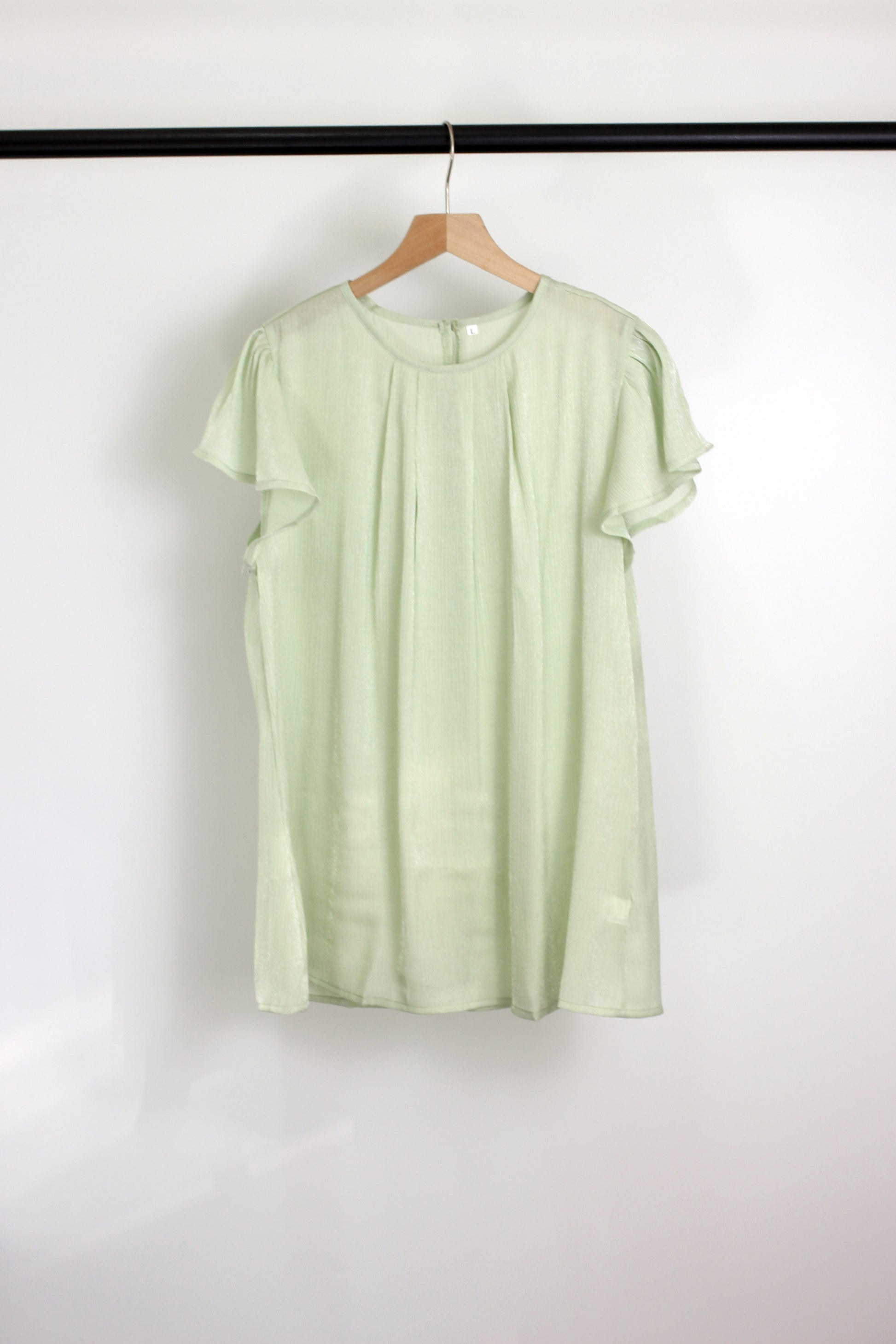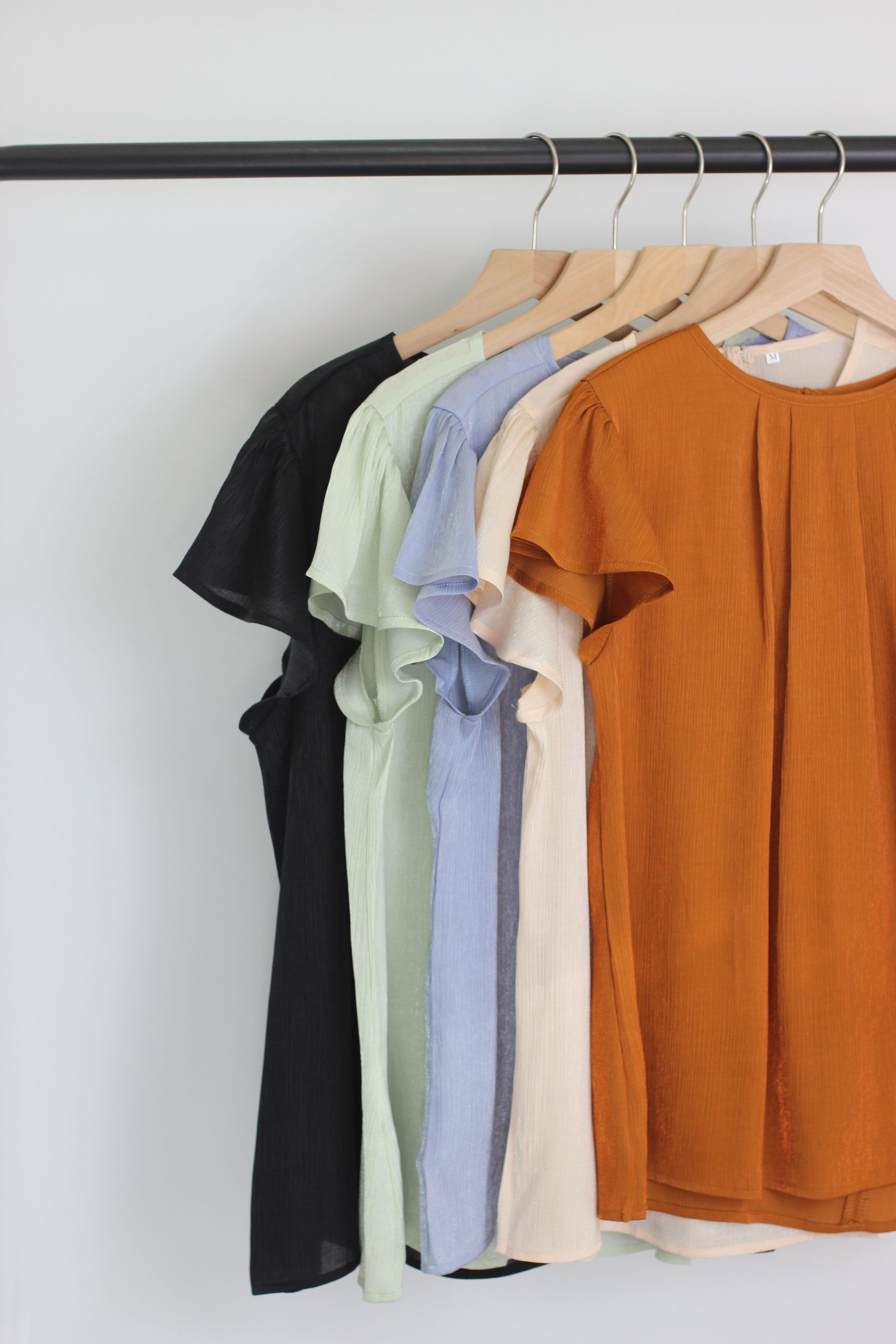 The loose fit and soft fabric will have you feeling like you're floating on clouds. This top features round neckline, back k-hole with button closure, pleated front detail, ruffle short sleeve.