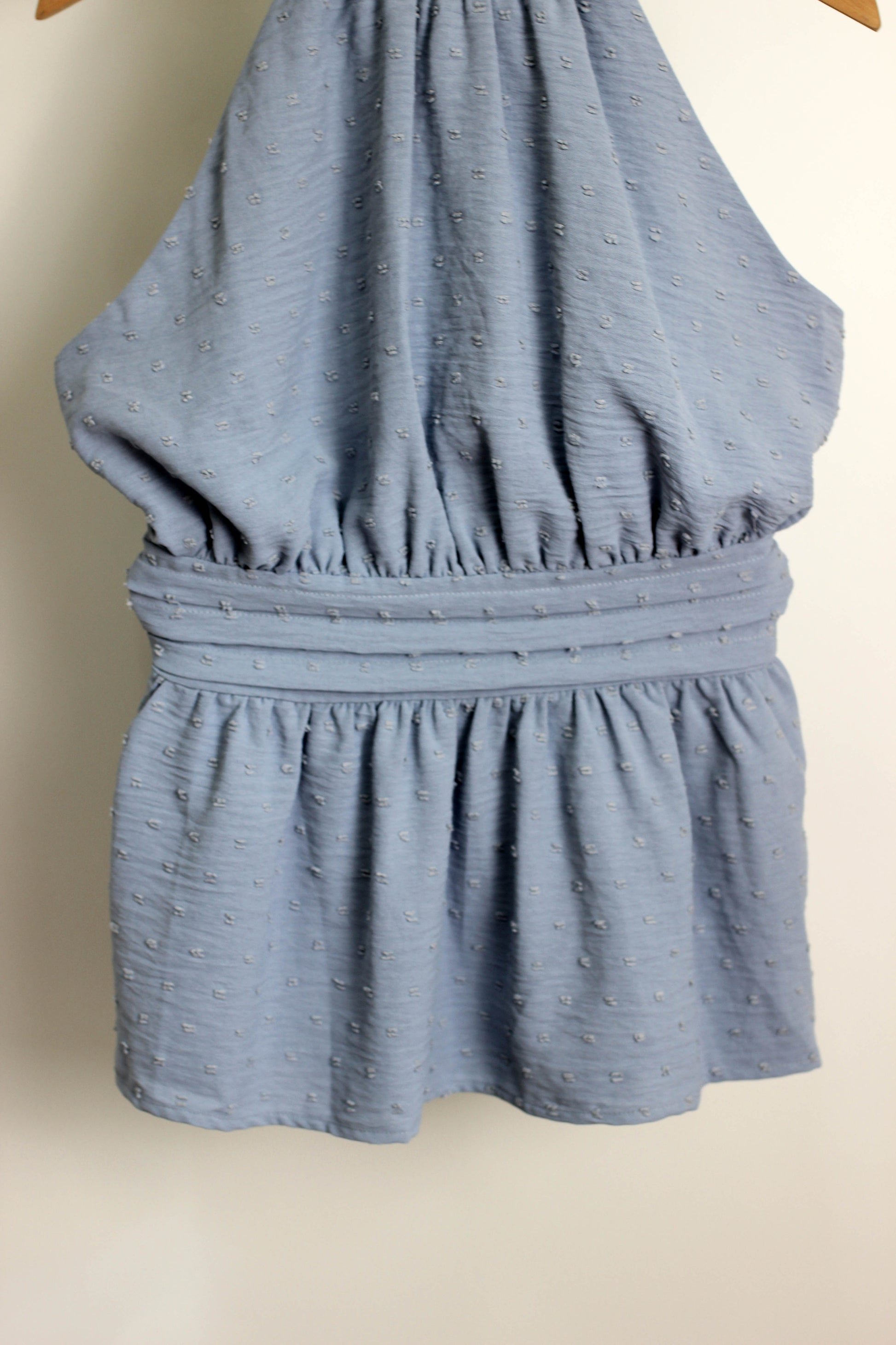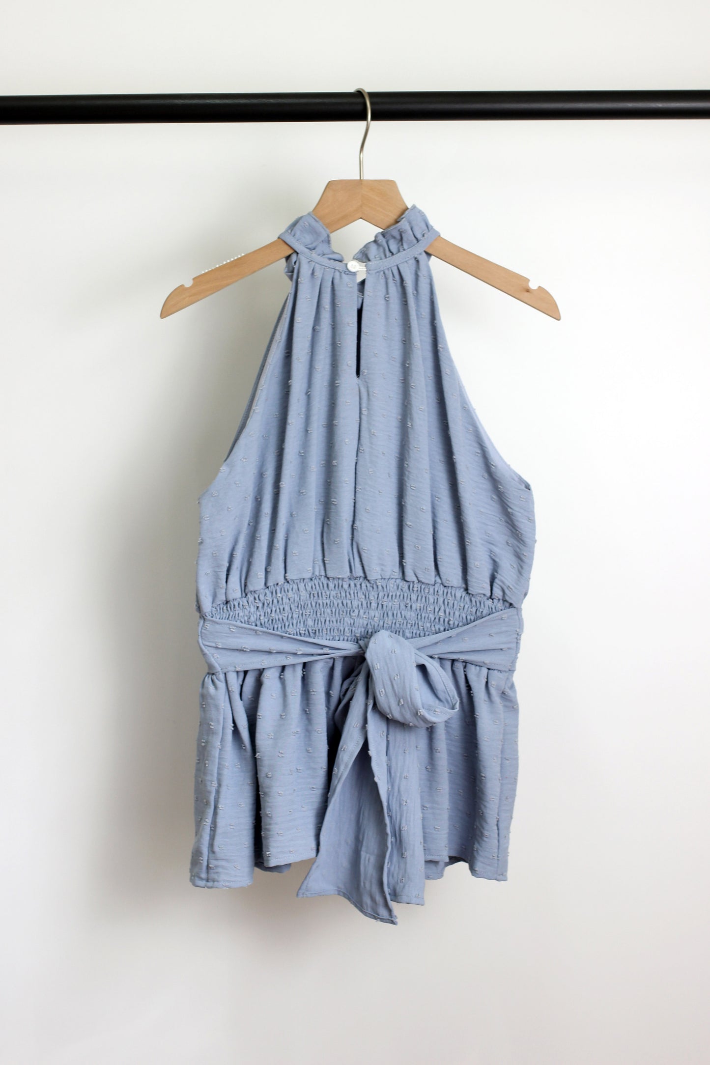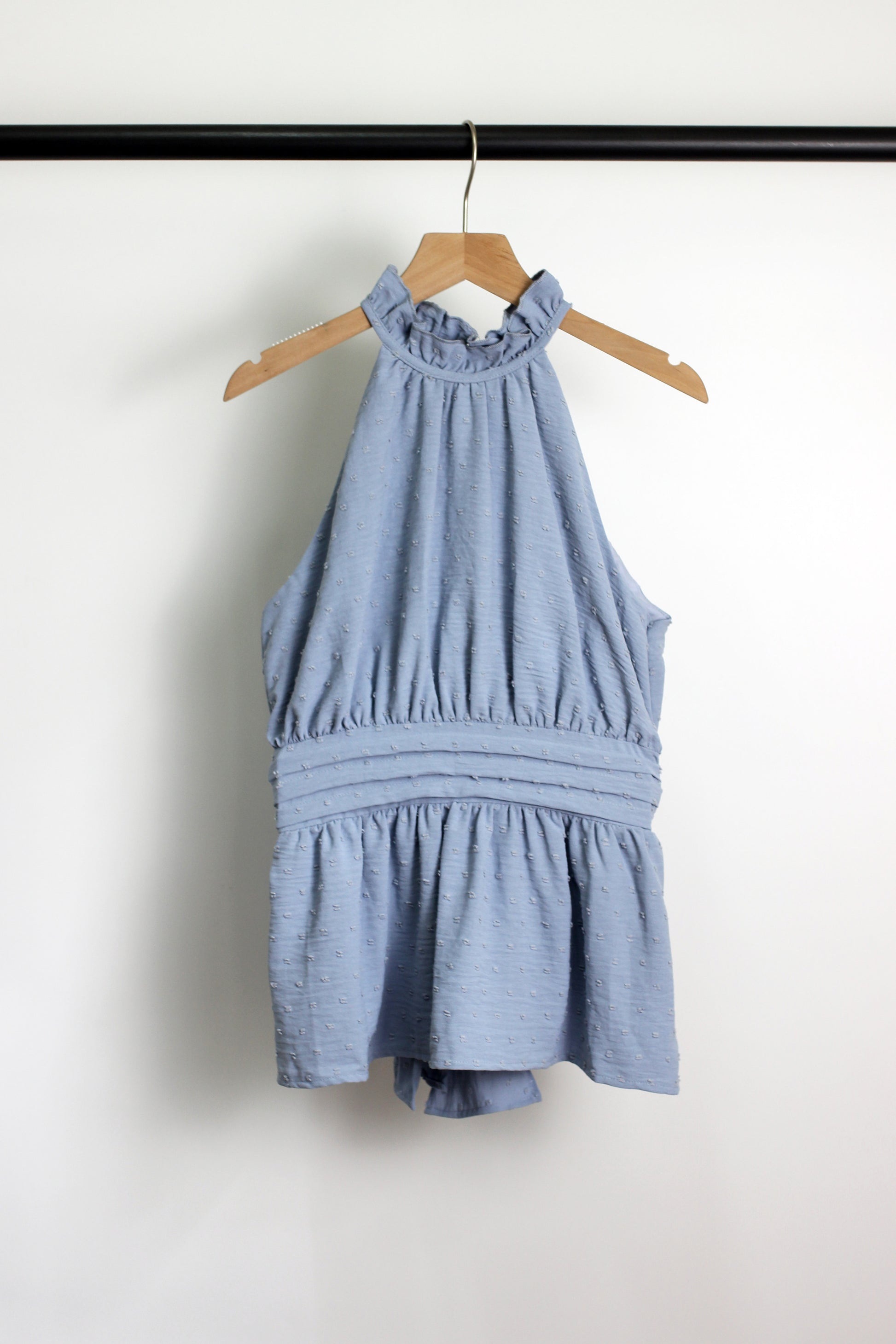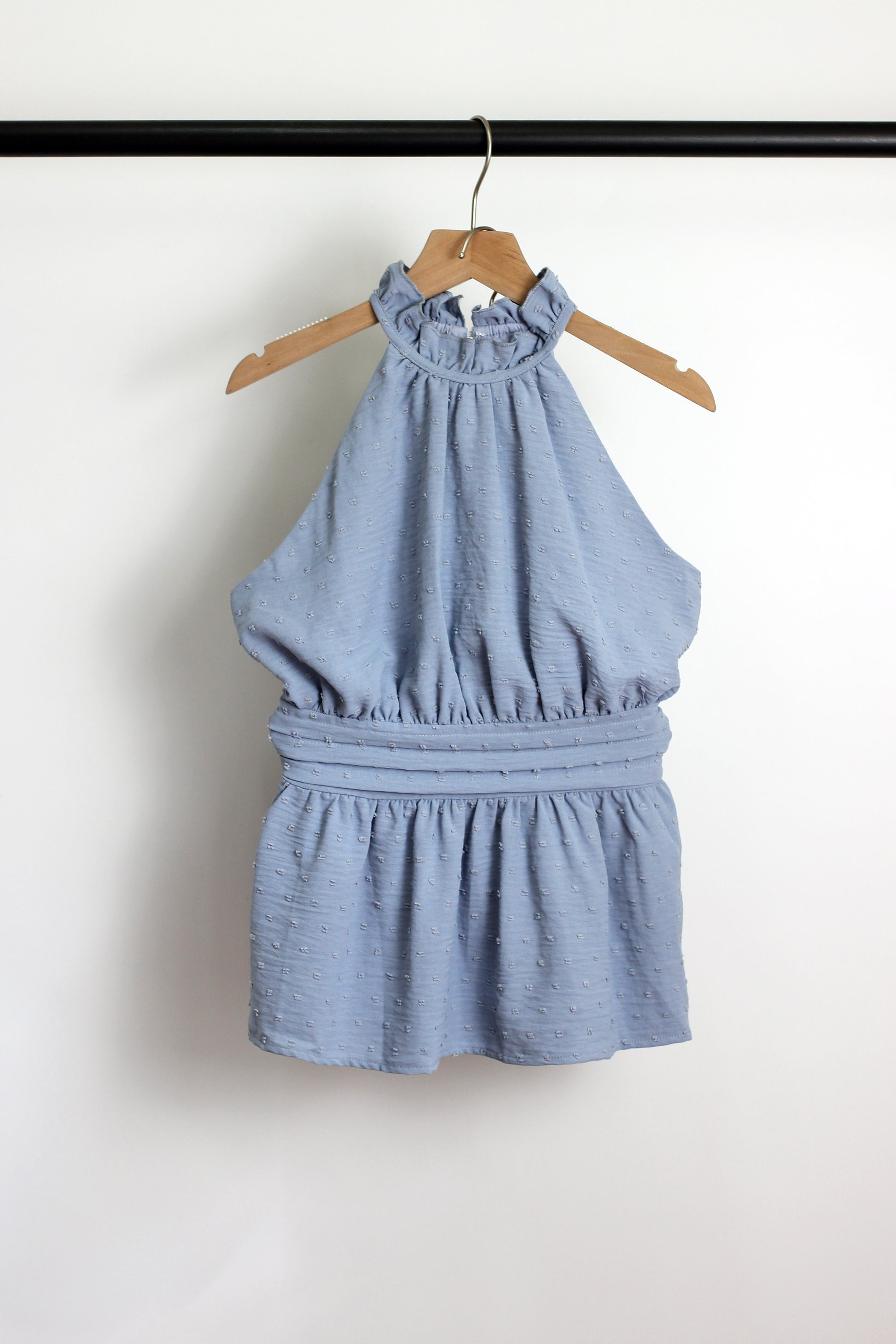 Pair your favorite bottoms with the Allure Ruffle Mock Neck Top and you'll always make an impression! This top features ruffle mock neck with a button closure at back, sleeveless bodice, pleated detail at waist and tie design.