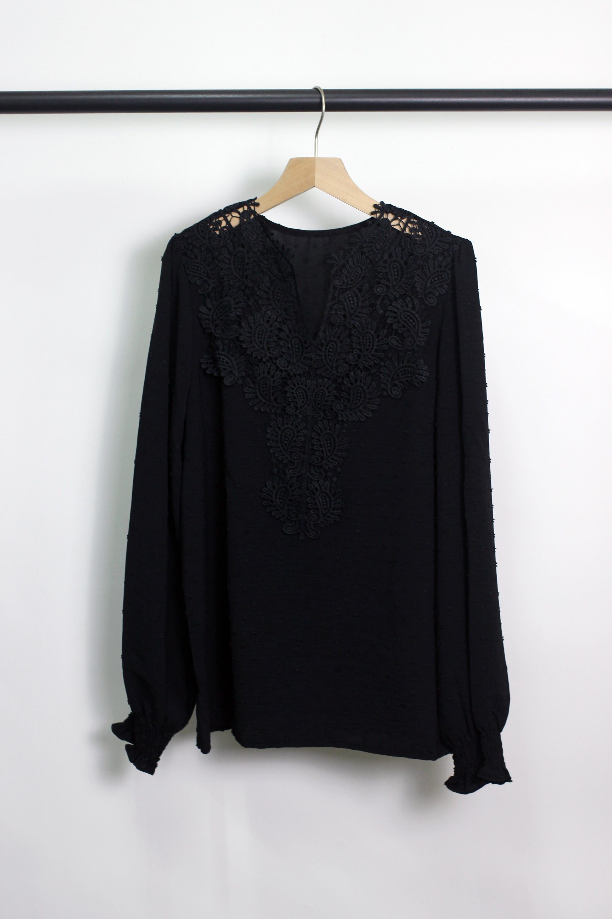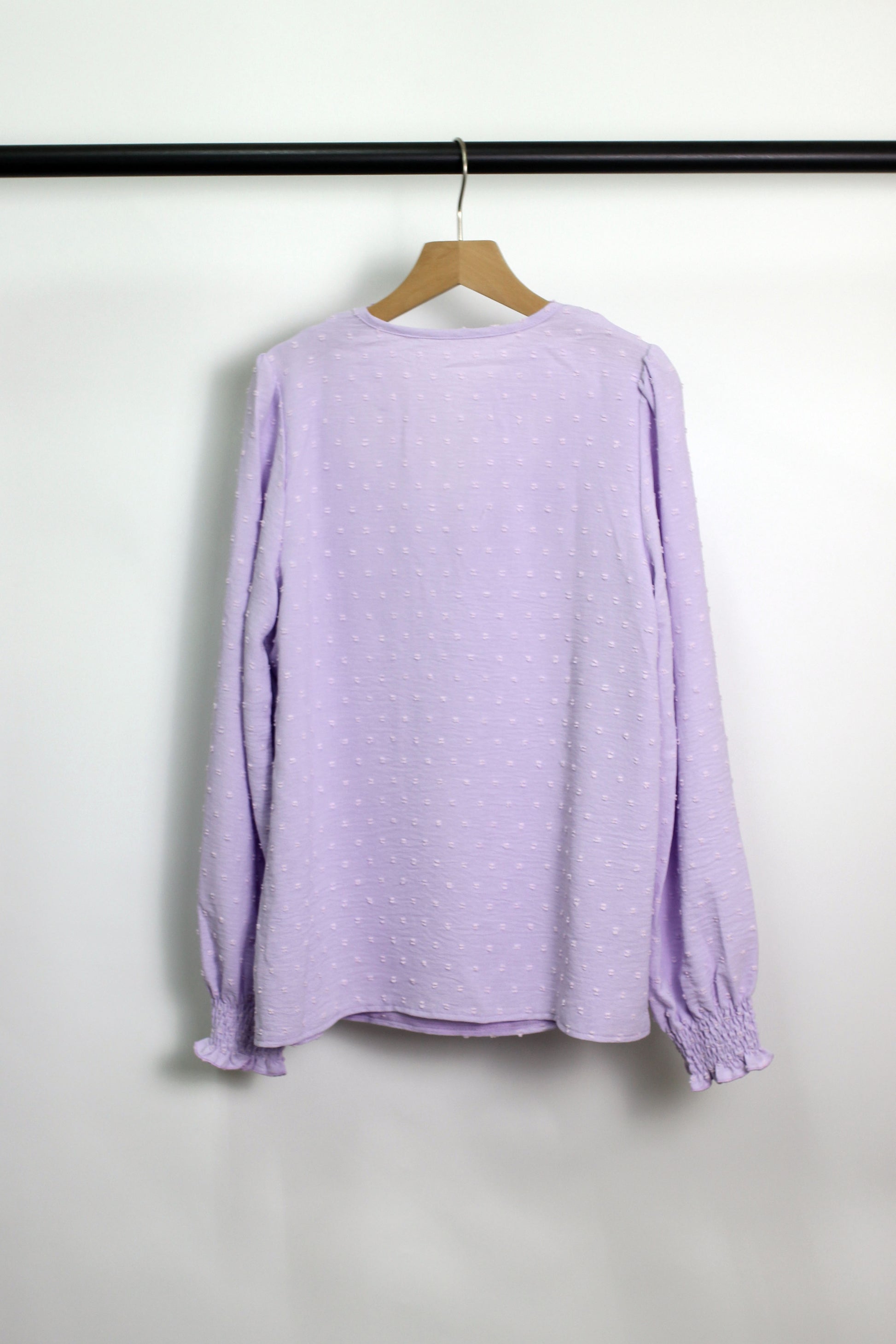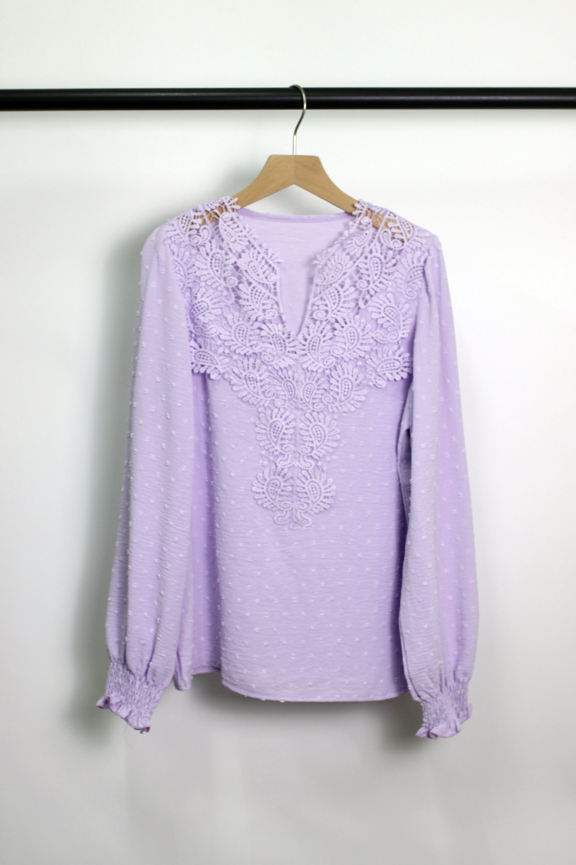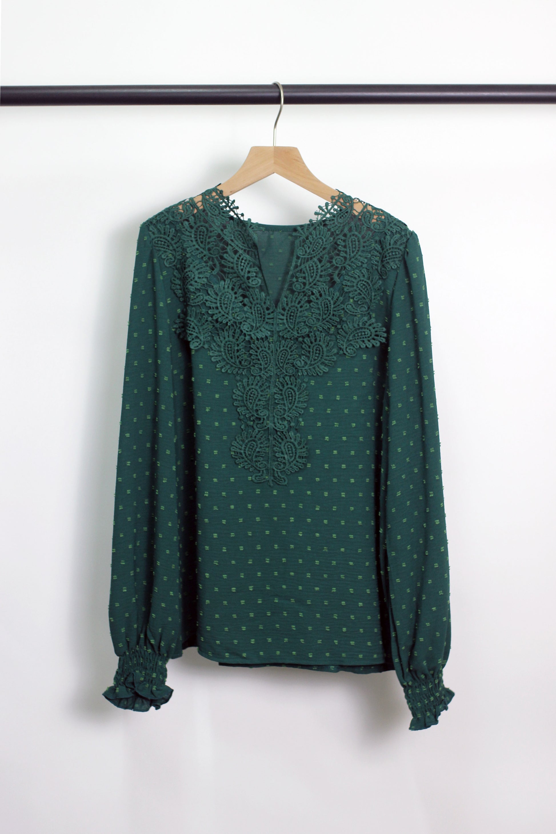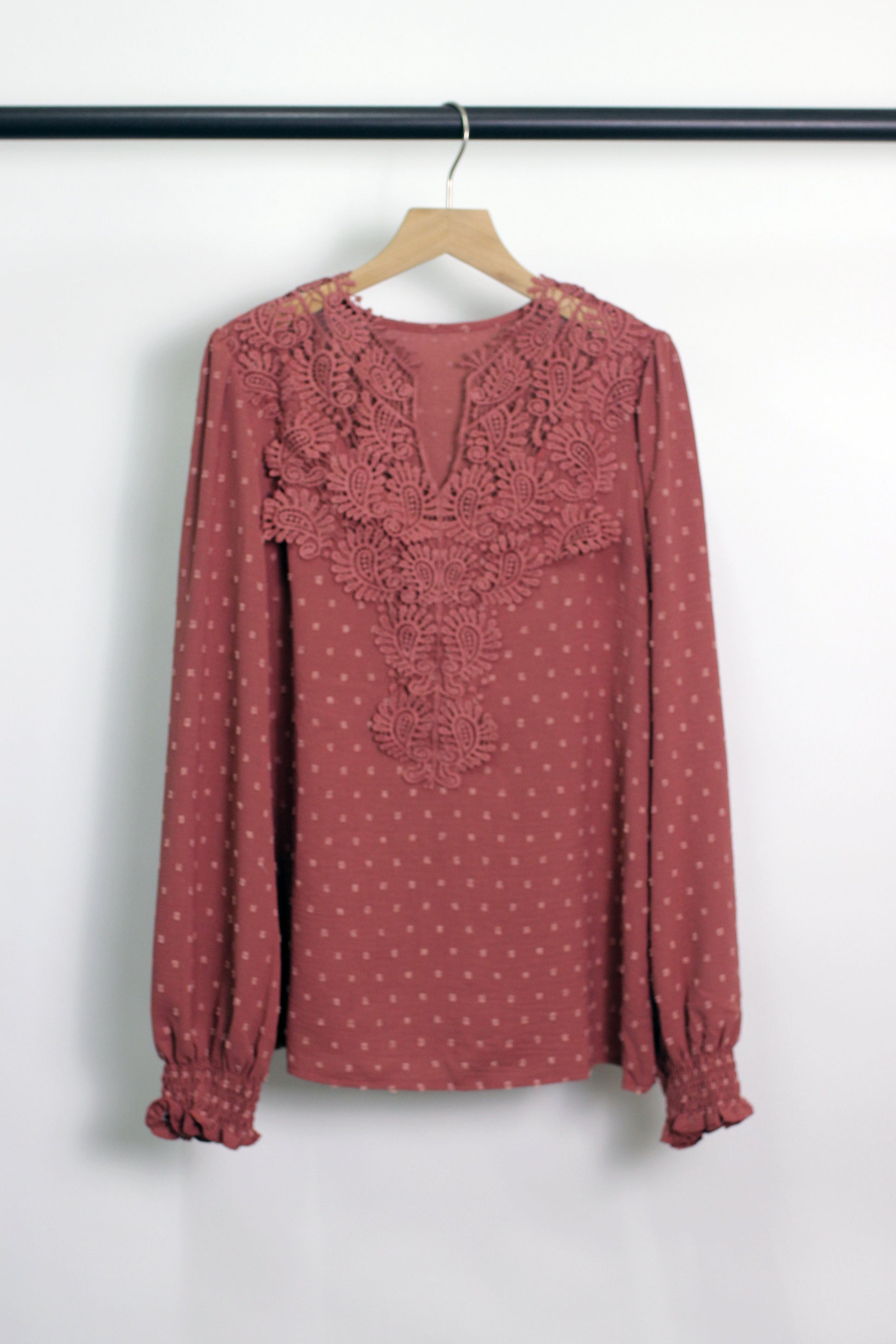 This blouse features a rich color hue with a detailed white lace neckline. The fabric has small polka dots throughout, and the sleeves are long with elastic cuffs. The blouse is designed with a flowy, feminine silhouette.