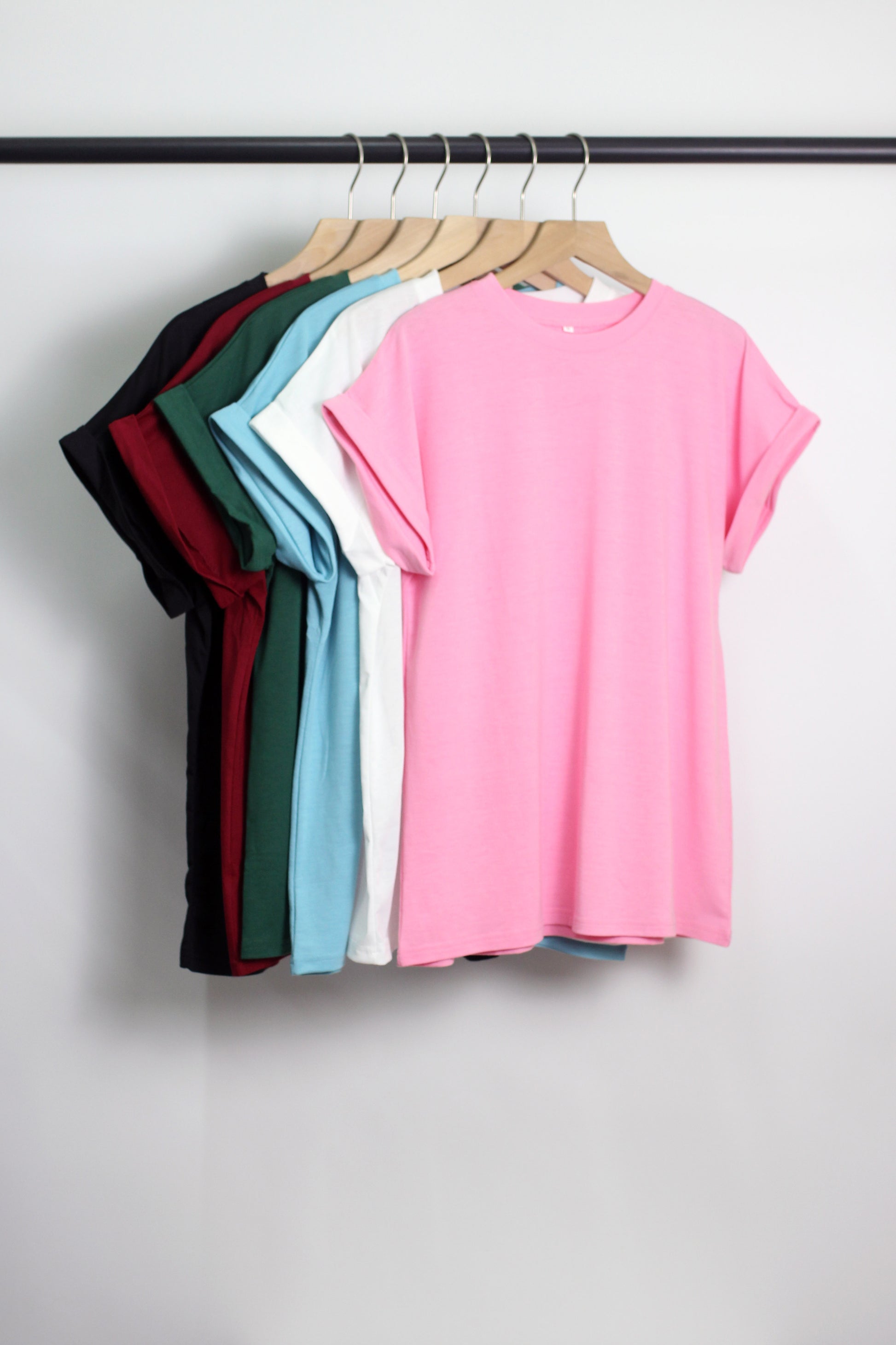 A classic and versatile short-sleeve T-shirt designed for effortless everyday wear. Featuring a crew neckline and rolled sleeves, this relaxed-fit tee offers a stylish yet comfortable look. Made from a soft and breathable fabric, it provides all-day comfort and is perfect for layering or wearing alone. Available in multiple vibrant and neutral colors, this wardrobe essential pairs well with jeans, skirts, shorts, or joggers for a casual and trendy outfit.