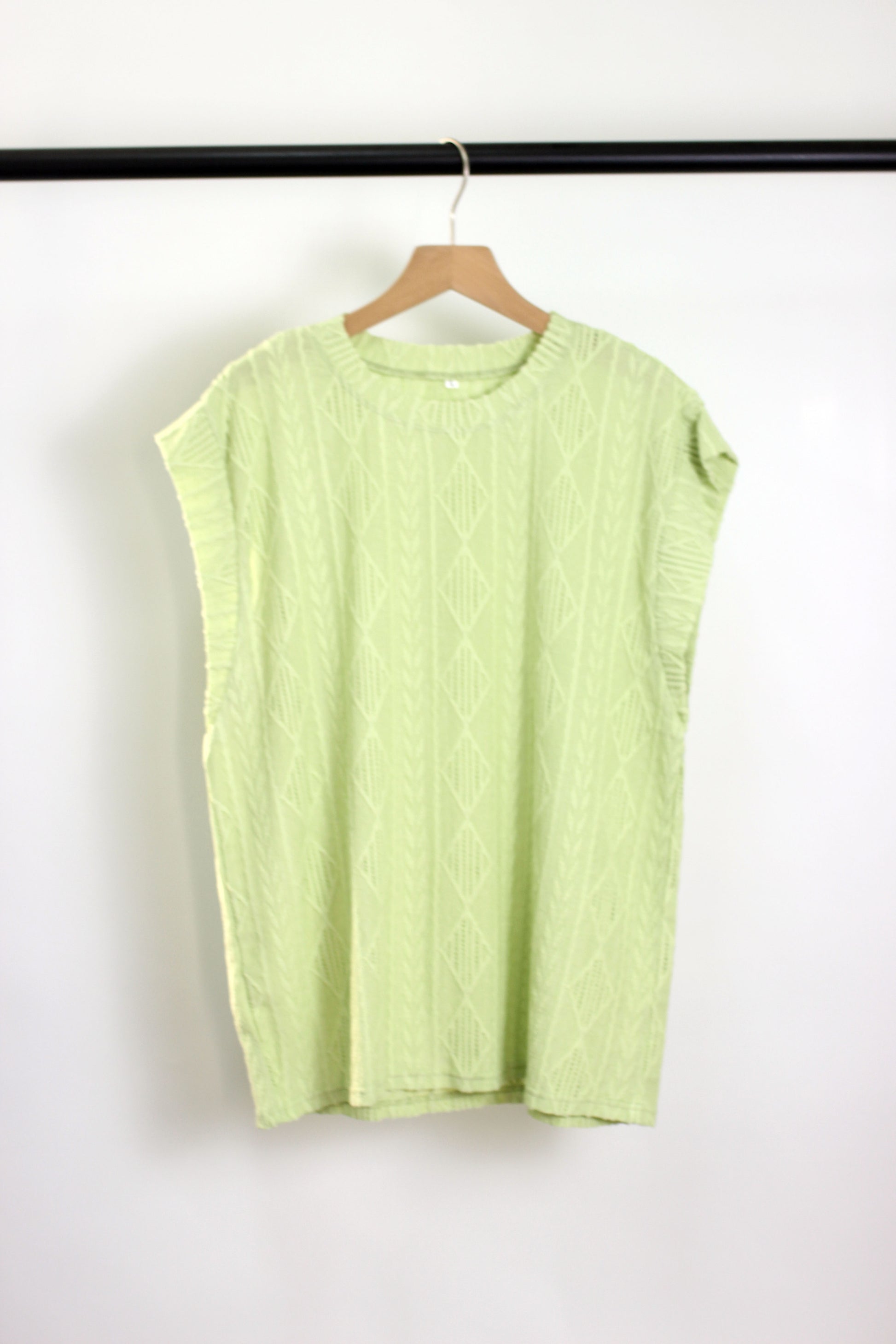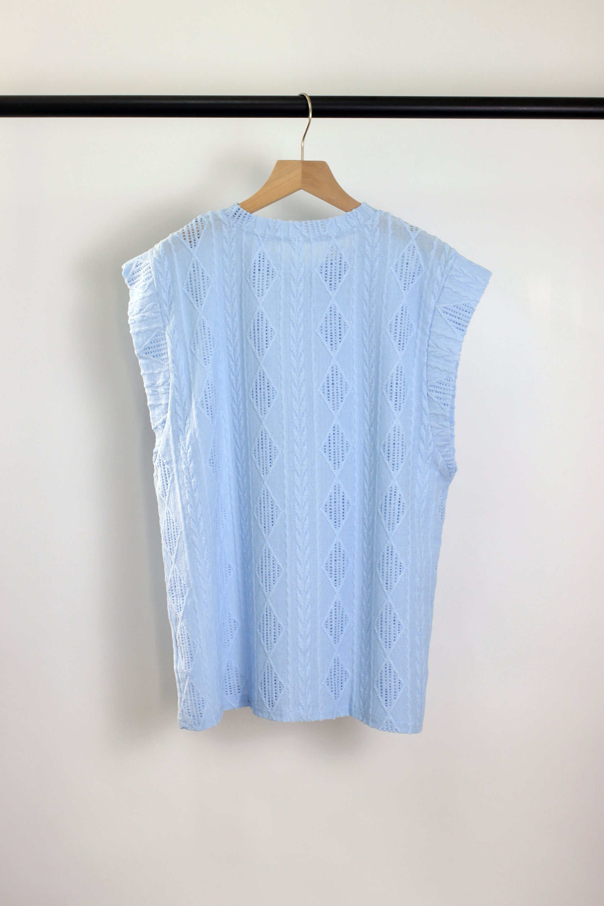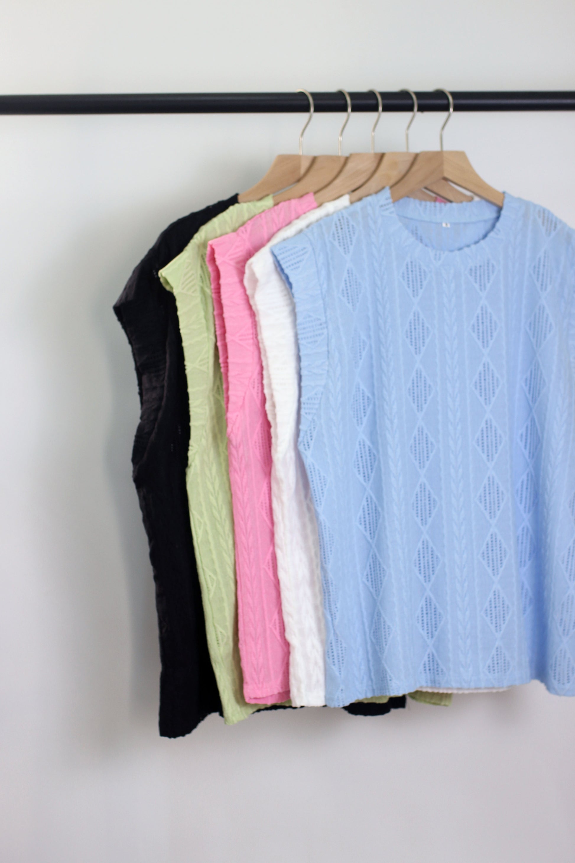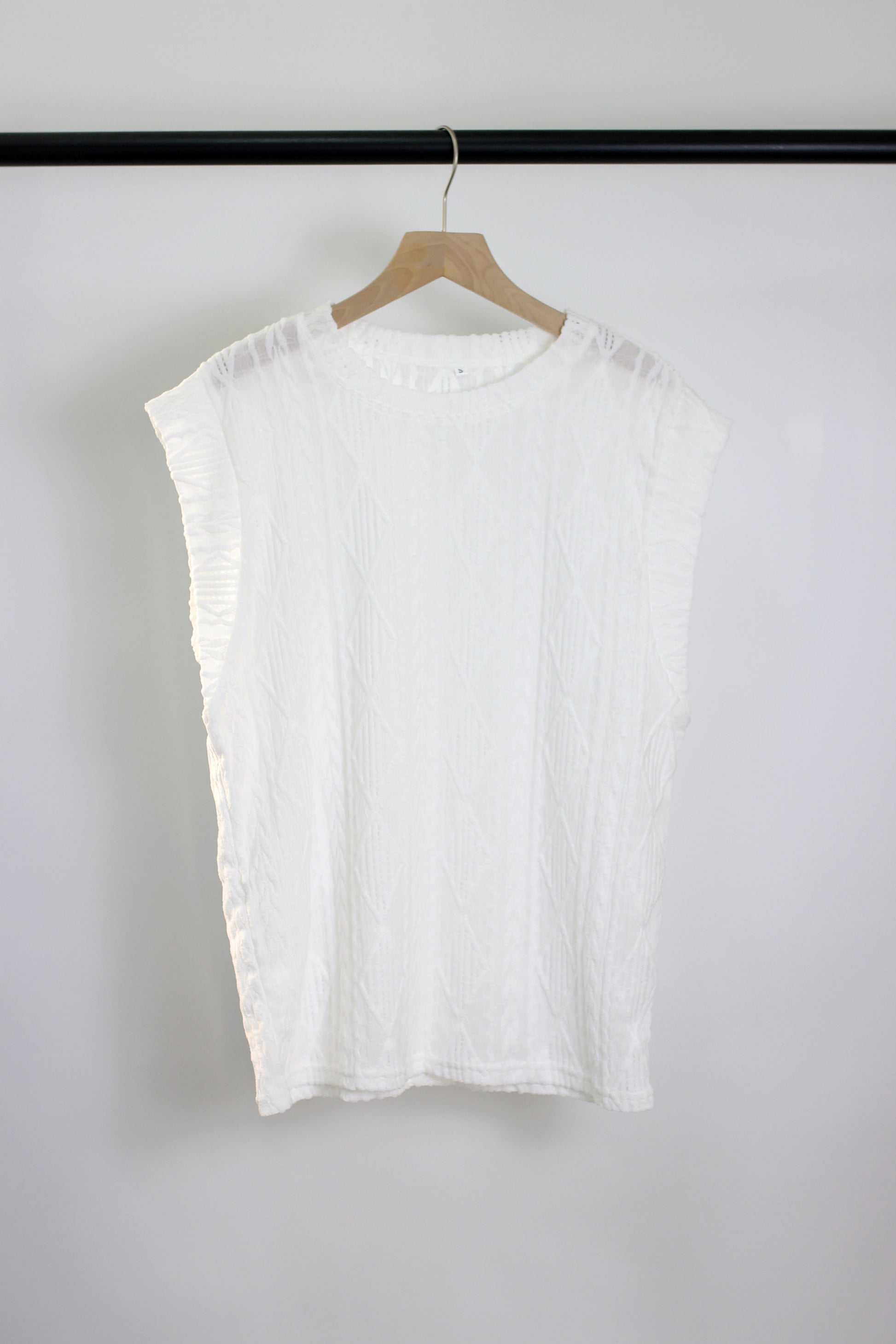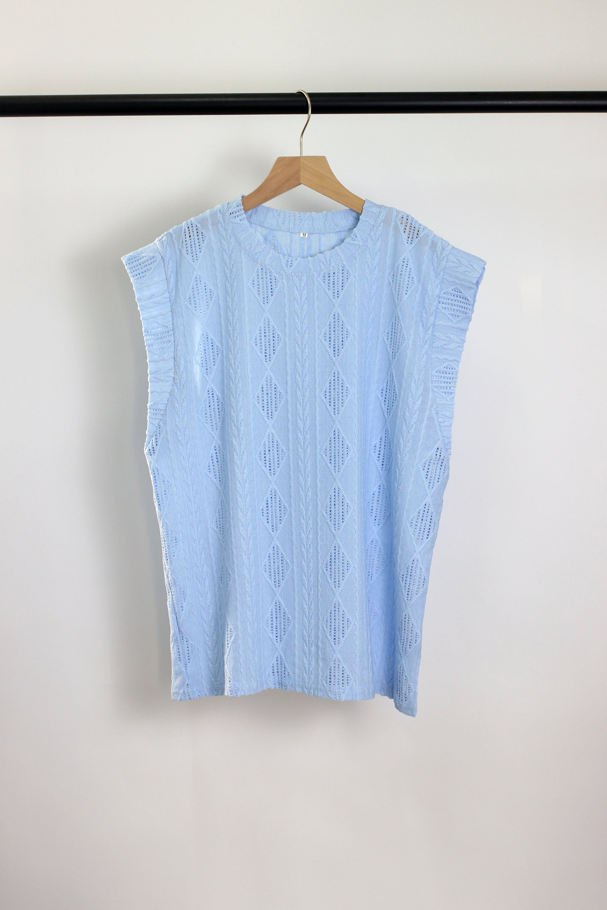A lightweight and elegant sleeveless blouse featuring a delicate geometric lace pattern for a sophisticated yet breathable design. This relaxed-fit top has a classic round neckline and cap-style sleeves, offering a versatile and feminine touch to any wardrobe.