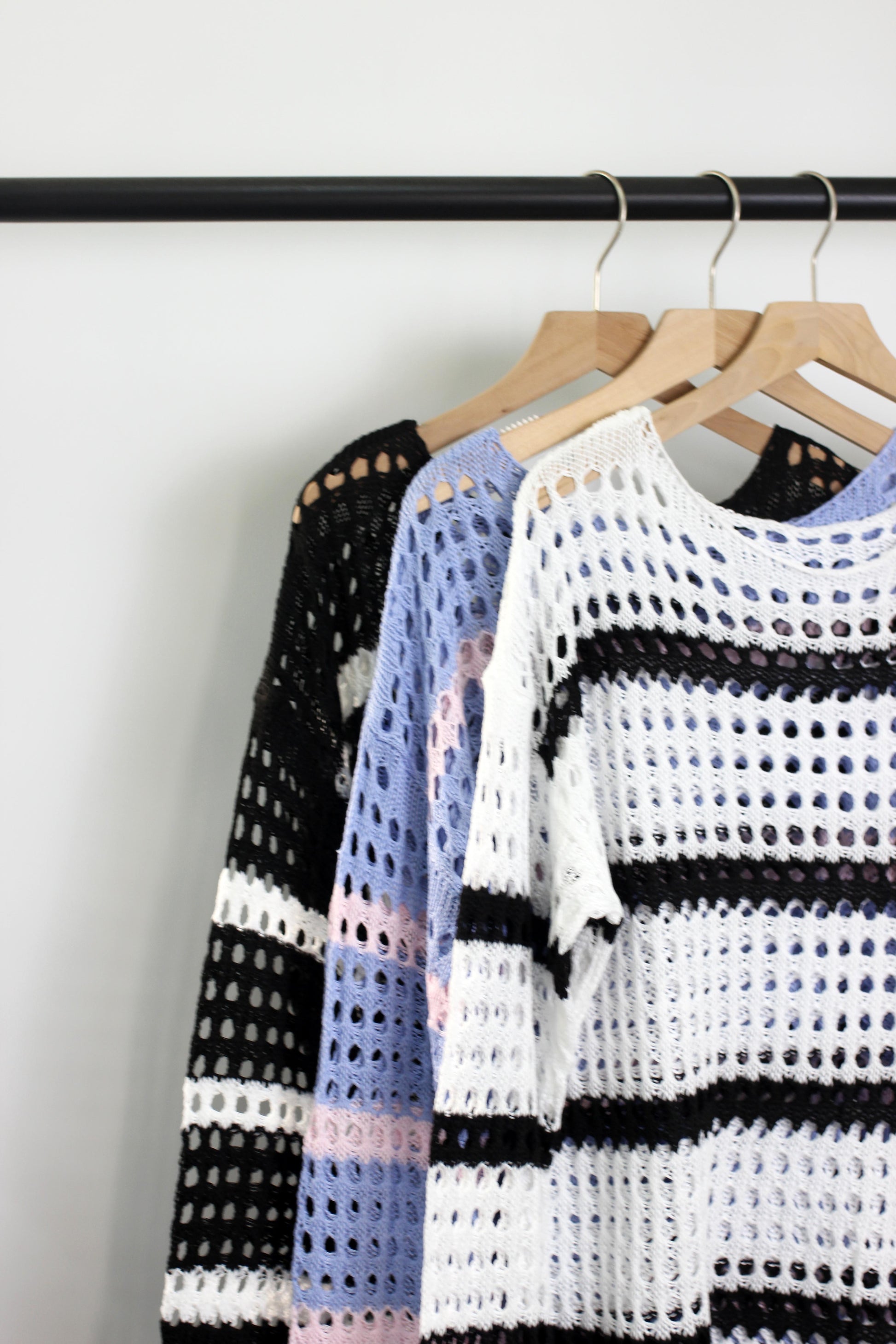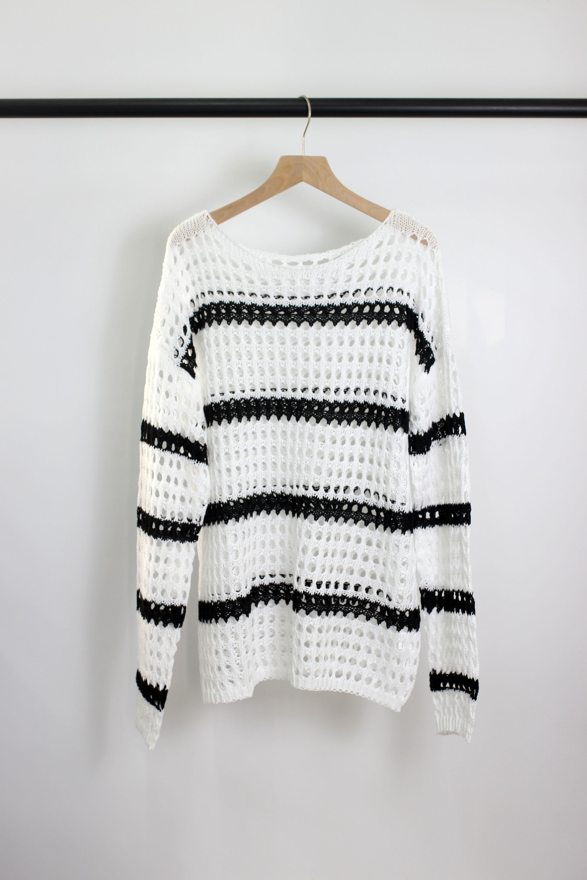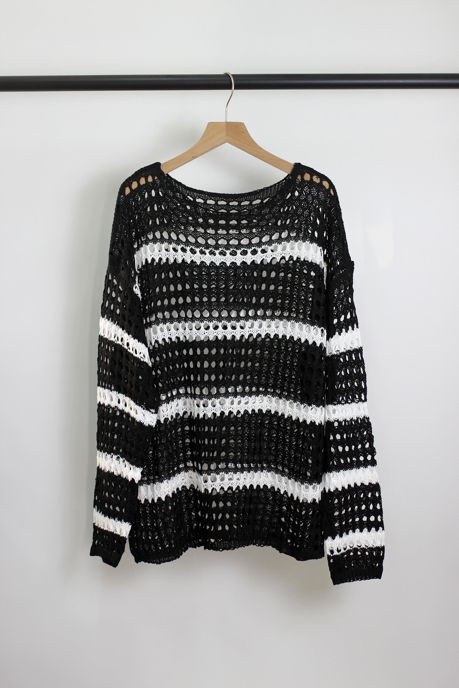 A lightweight open-knit crochet sweater made from 100% polyester, featuring a trendy striped design with a breathable, airy texture. This boho-inspired long-sleeve pullover has a relaxed fit, making it ideal for layering over swimsuits, camisoles, or bralettes. The soft and stretchy fabric ensures comfort and easy movement, perfect for casual outings, beachwear, or cool summer evenings. Available in multiple color combinations, this chic and versatile sweater is a must-have for a fashion-forward wardrobe.