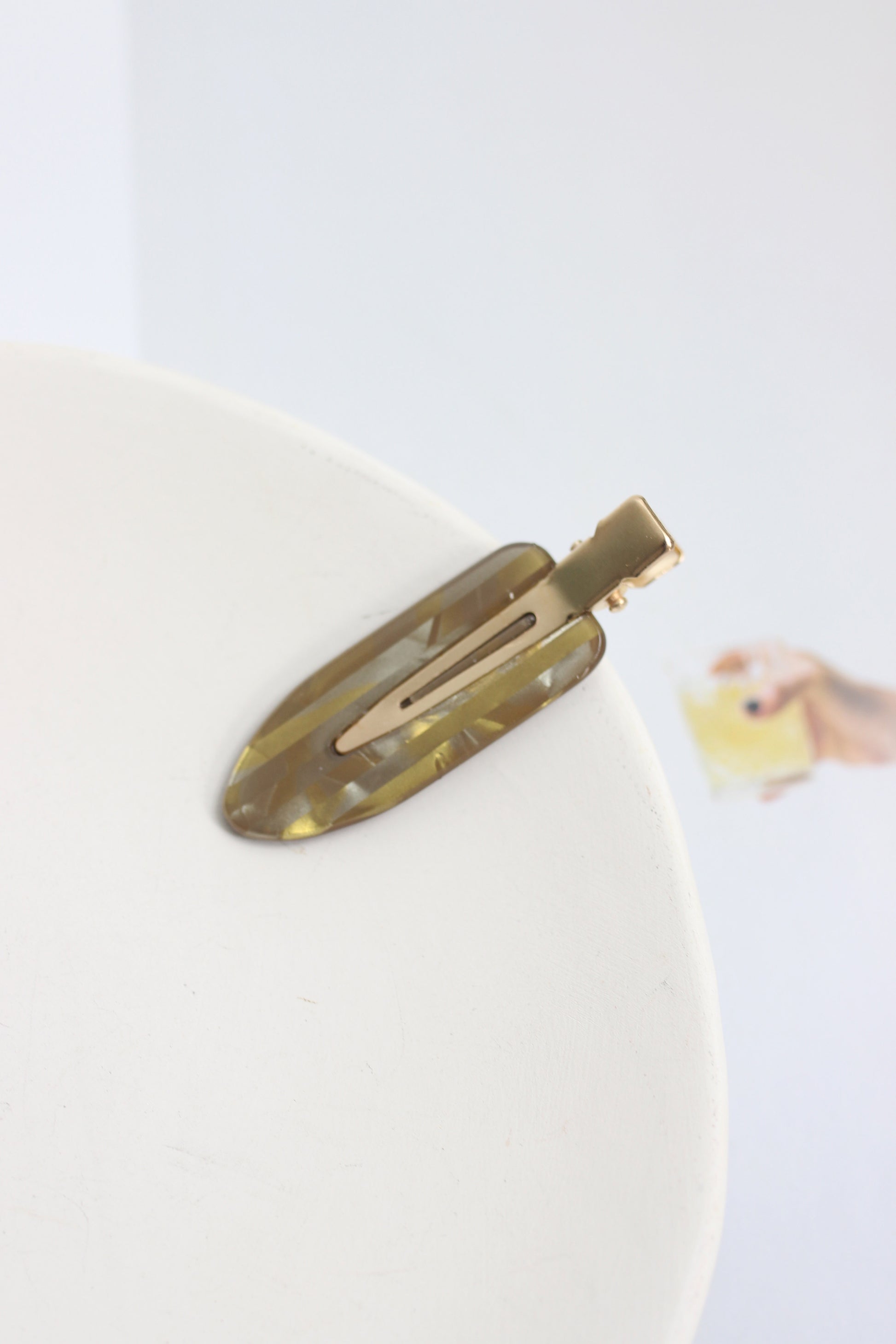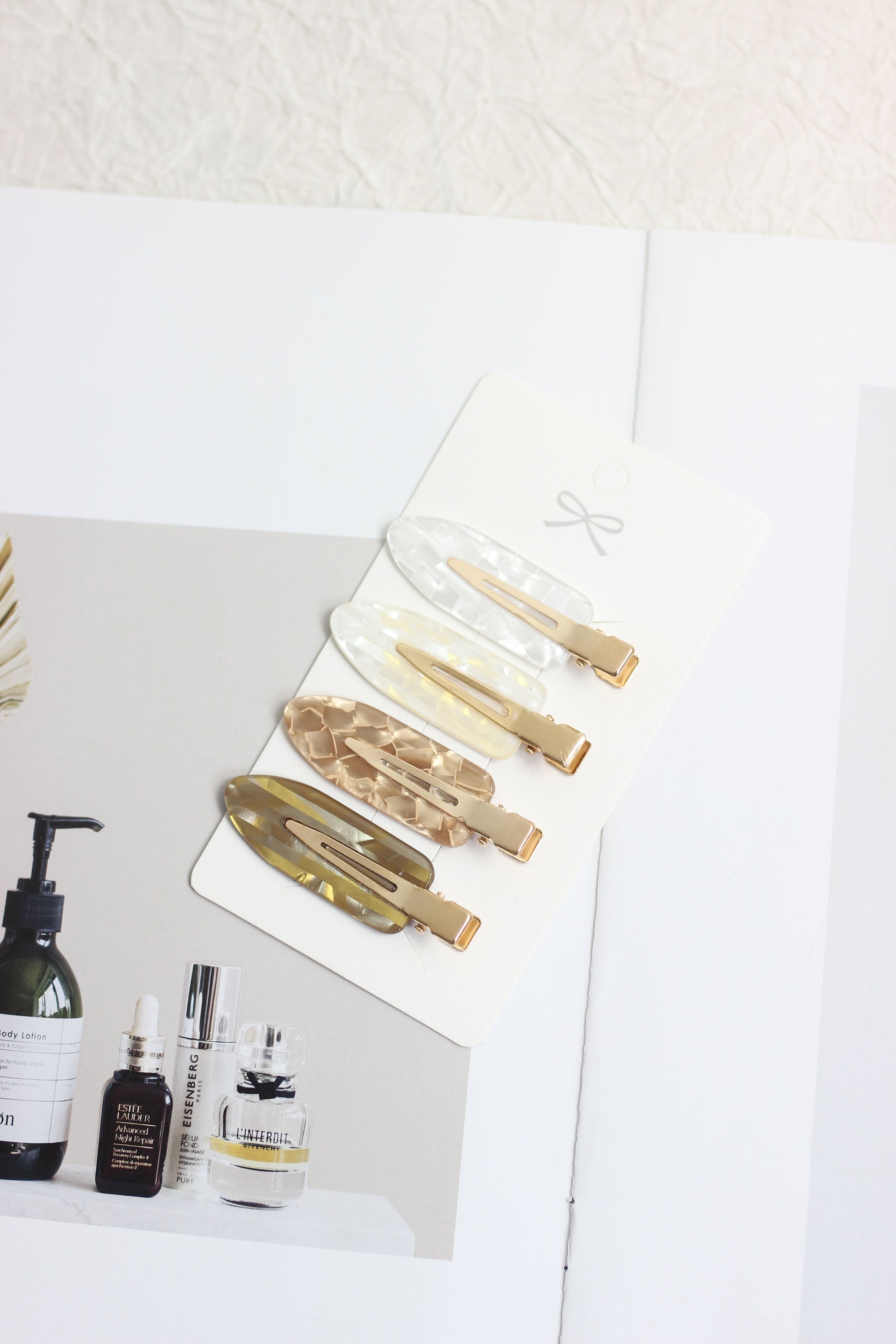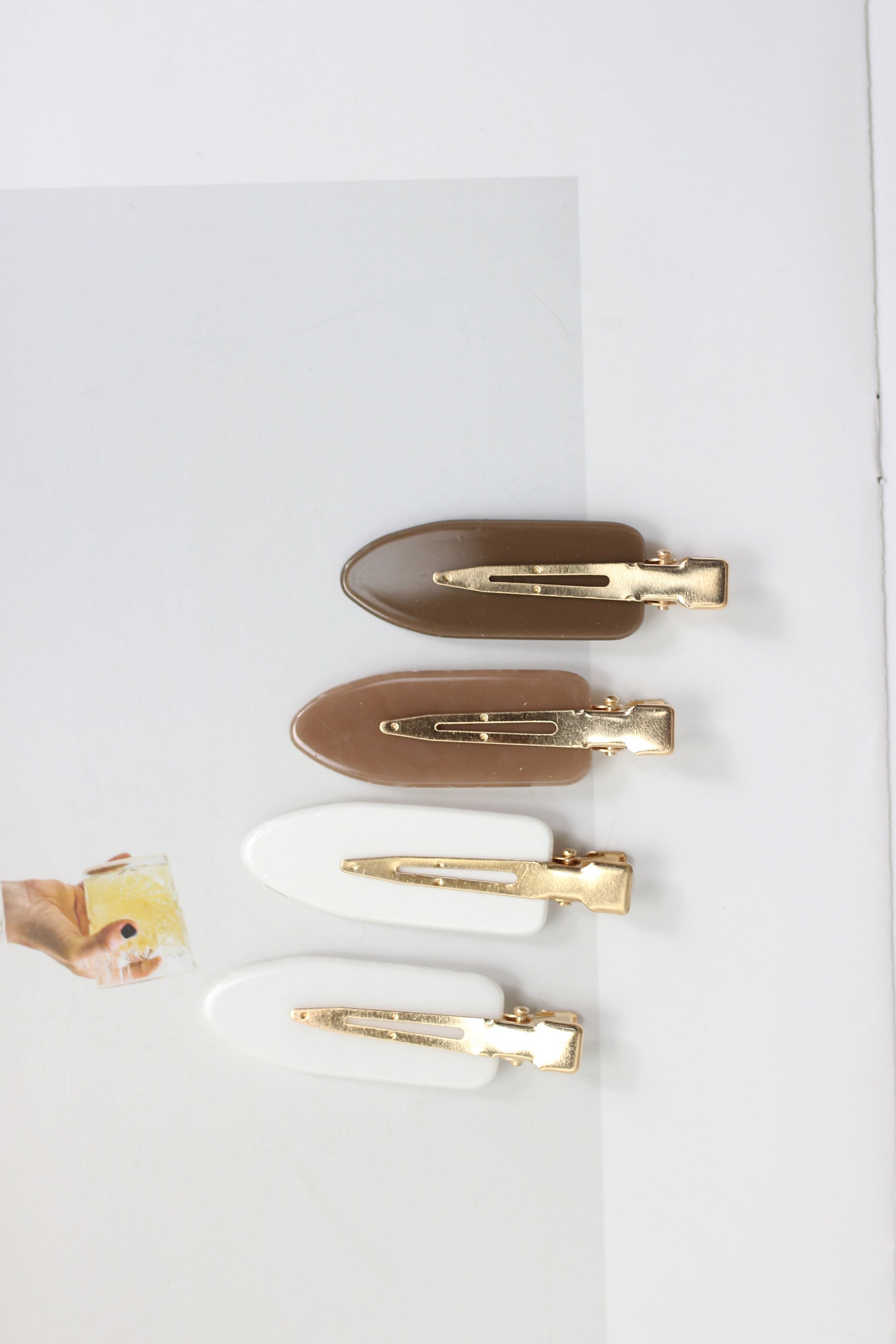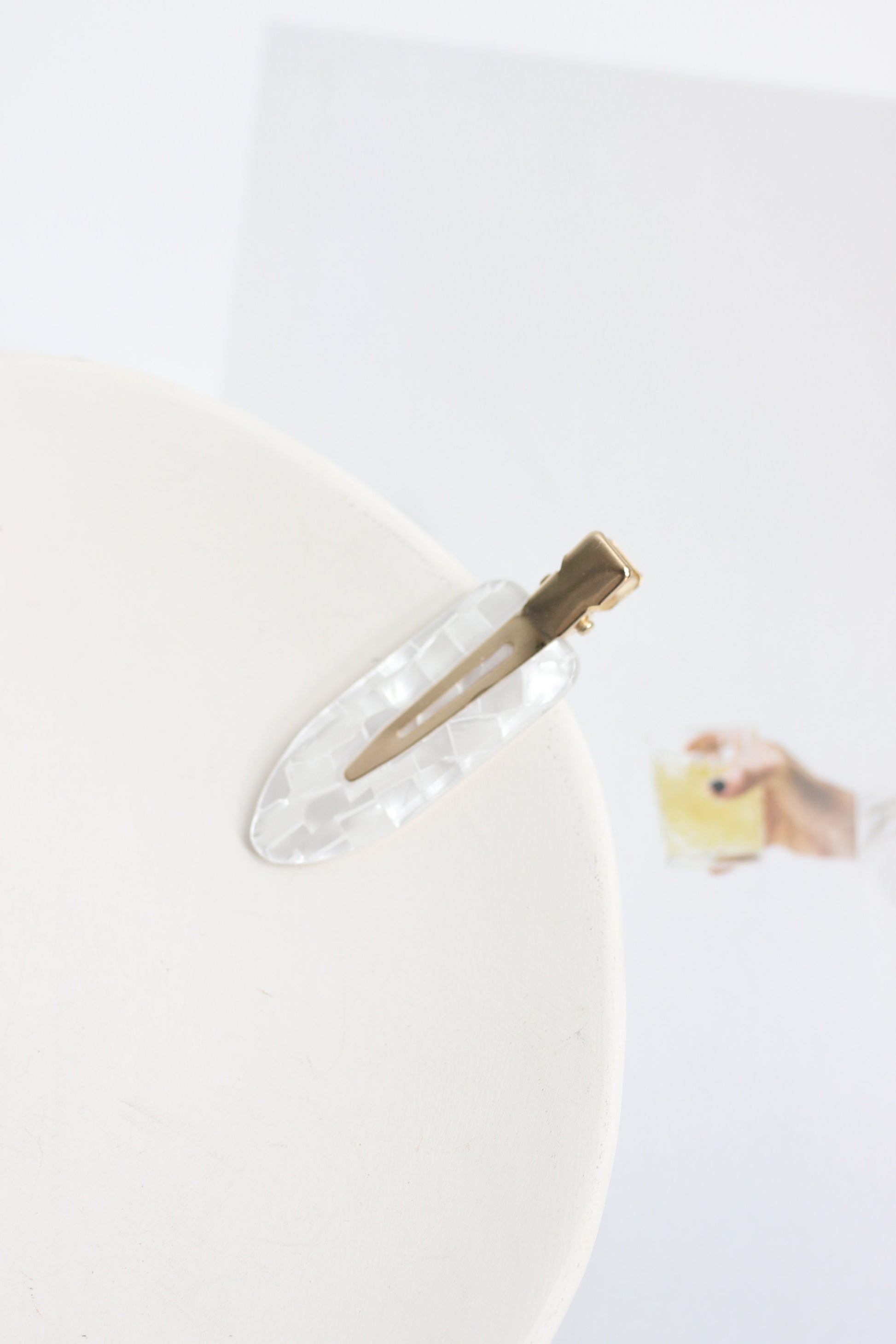 This marbled resin hair clip set features a stunning mix of elegant acetate textures and gold-tone metal accents for a sophisticated yet trendy look. The sleek, elongated oval design adds a touch of modern minimalism, making these clips perfect for securing bangs, half-up hairstyles, or adding a chic touch to any look. Designed with a sturdy metal alligator clip, they provide a strong grip without pulling or slipping, ensuring comfort throughout the day. Whether for casual wear, work, or special occasions, these clips effortlessly elevate your hairstyle.