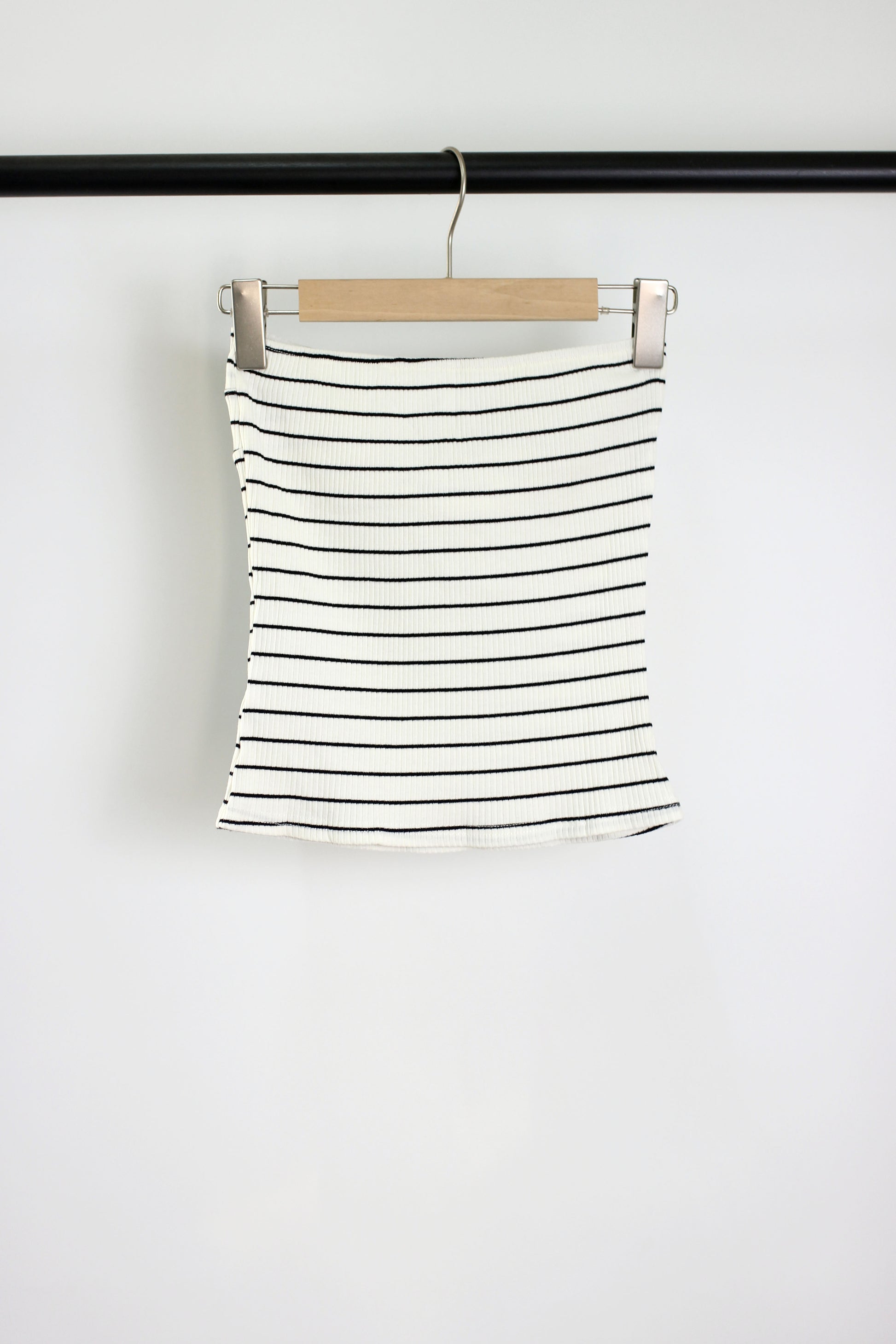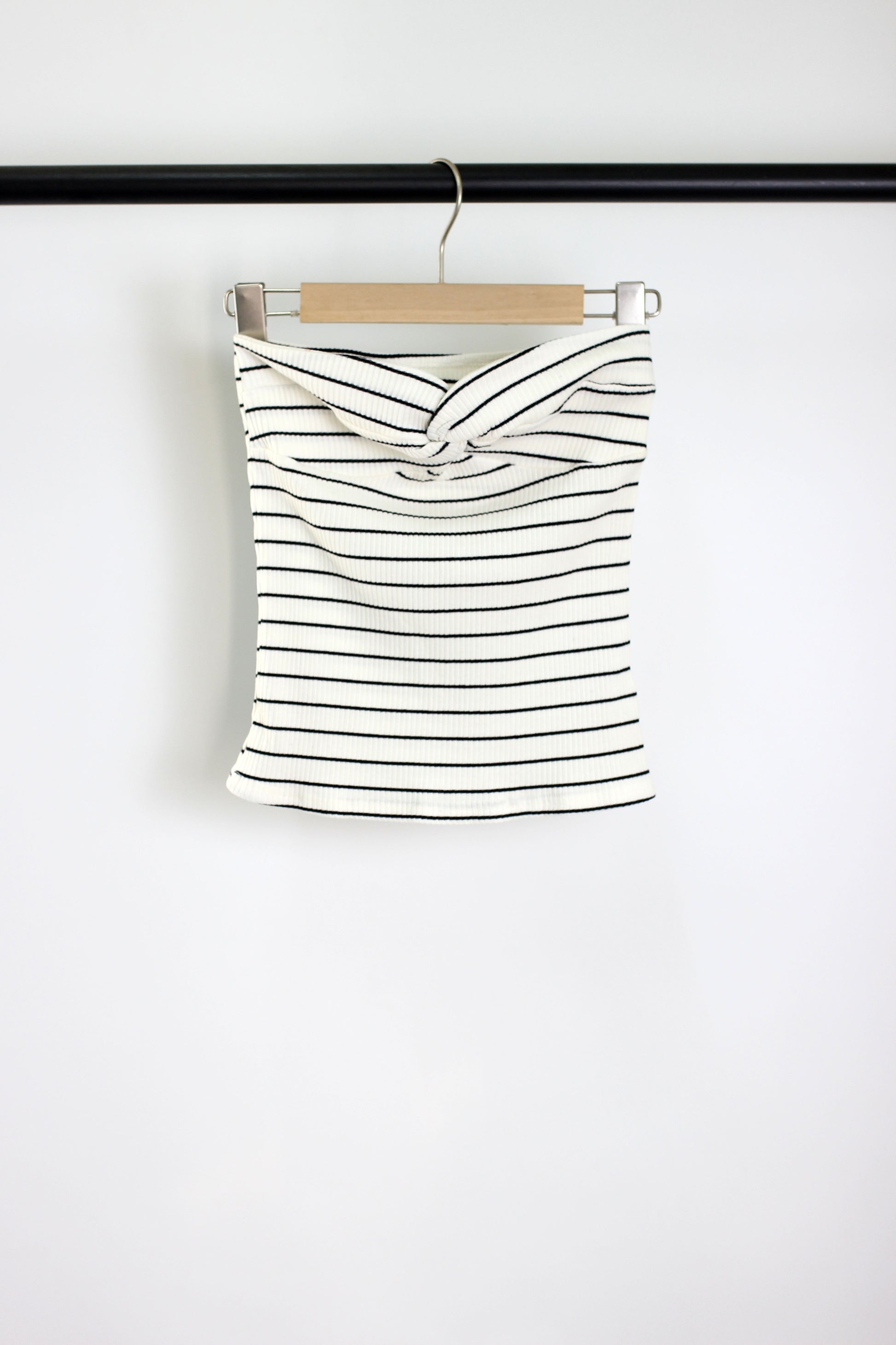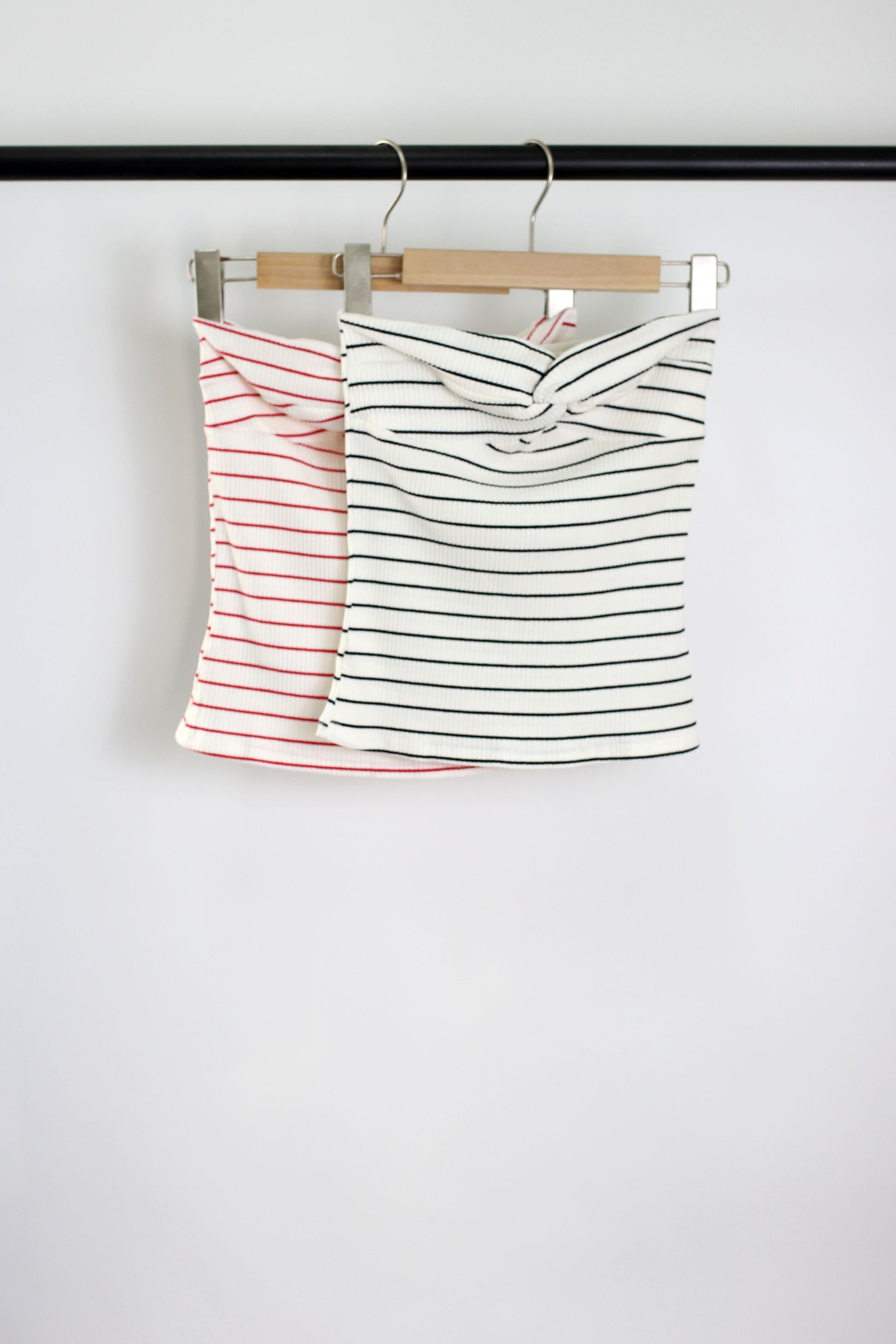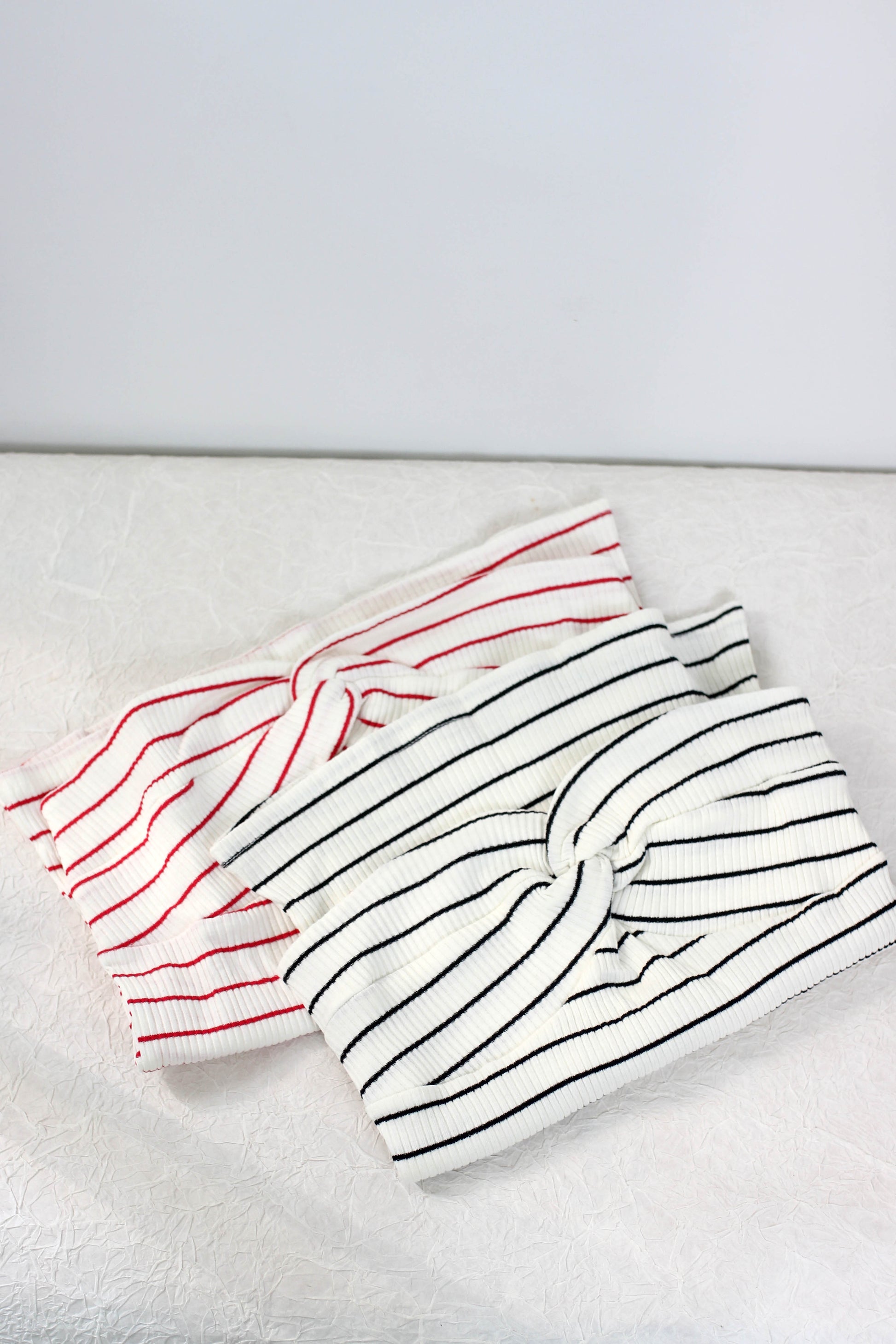 Trendy and stylish ribbed knit tube top featuring a classic horizontal striped pattern. This chic sleeveless top is designed with a twist knot detail at the bust, adding a touch of elegance and uniqueness. Made from soft and stretchy fabric, it ensures a comfortable and flattering fit. Perfect for summer outings, beachwear, or layering under jackets. Available in multiple color variations including white with black stripes and white with red stripes.