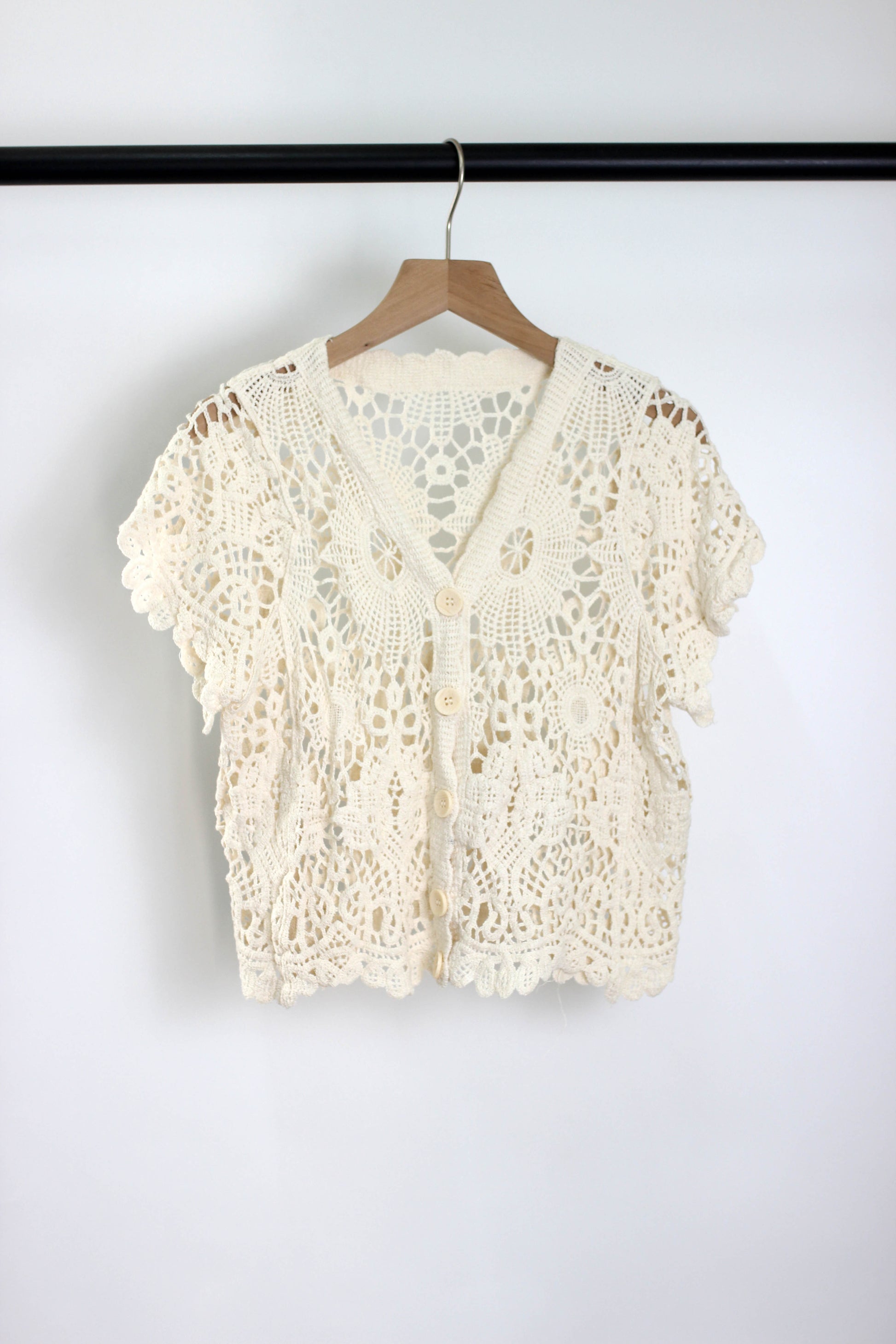 This elegant crochet lace cardigan is designed with intricate floral patterns, adding a boho-chic and feminine touch to your outfit. Featuring a delicate button-down front, short sleeves, and a scalloped hem, this lightweight openwork knit top is perfect for layering over a summer dress, a camisole, or a beach outfit.