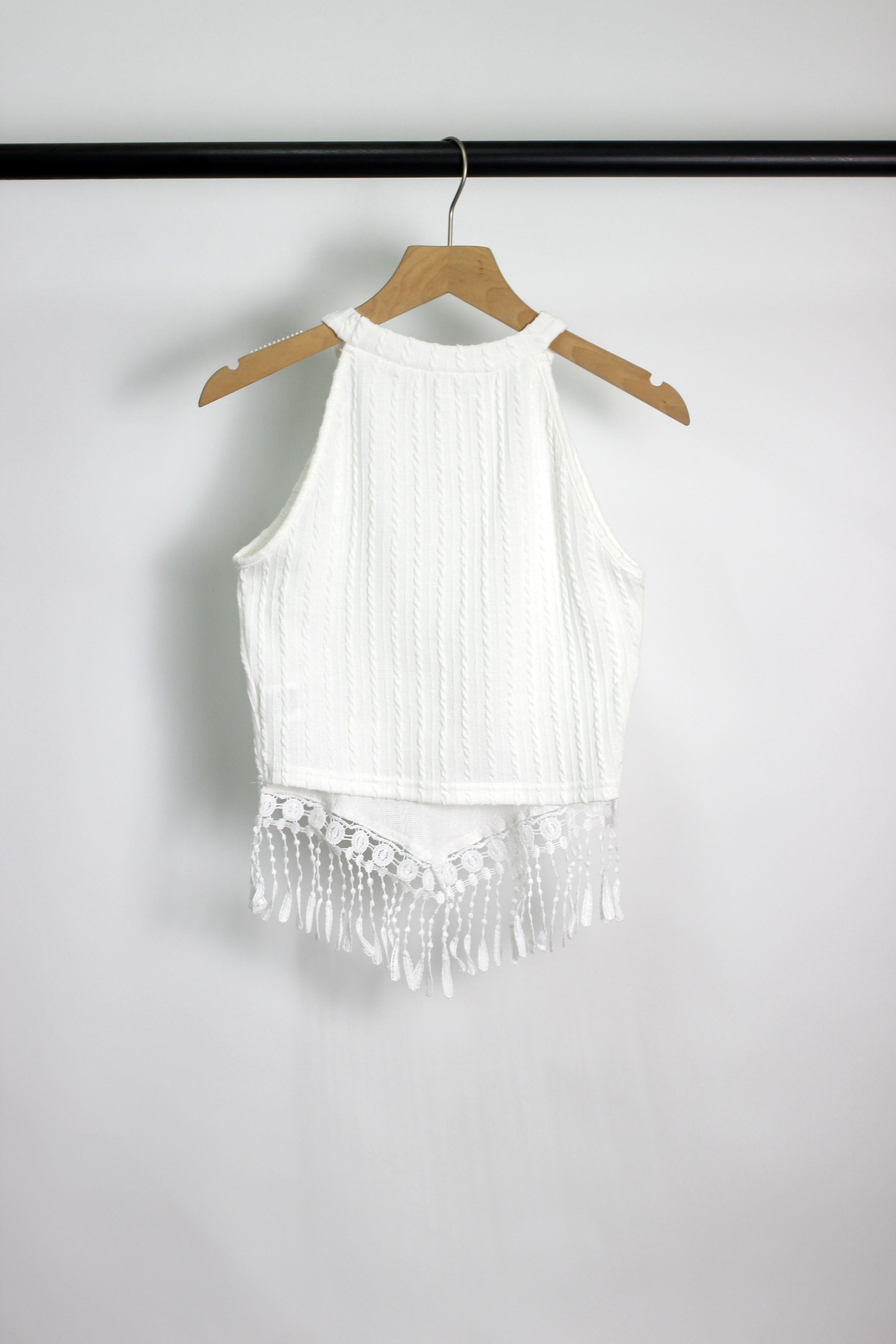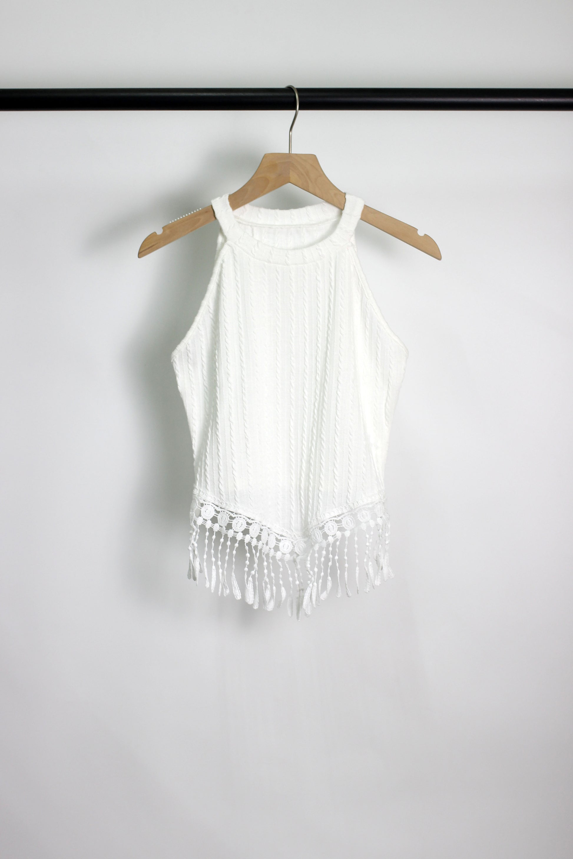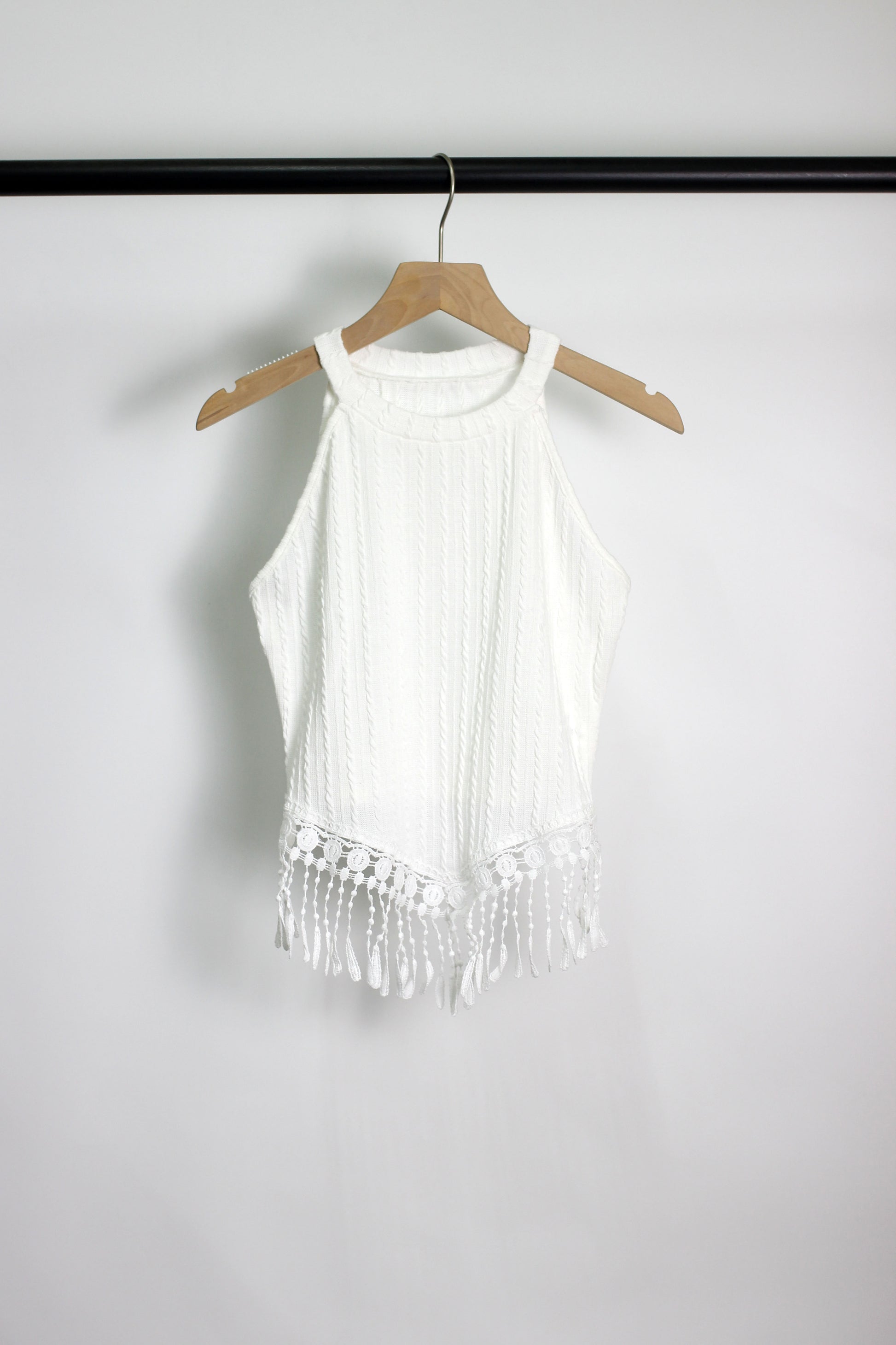 T2502YSQ18352 - Boho Chic Knit Halter Top with Fringe Trim