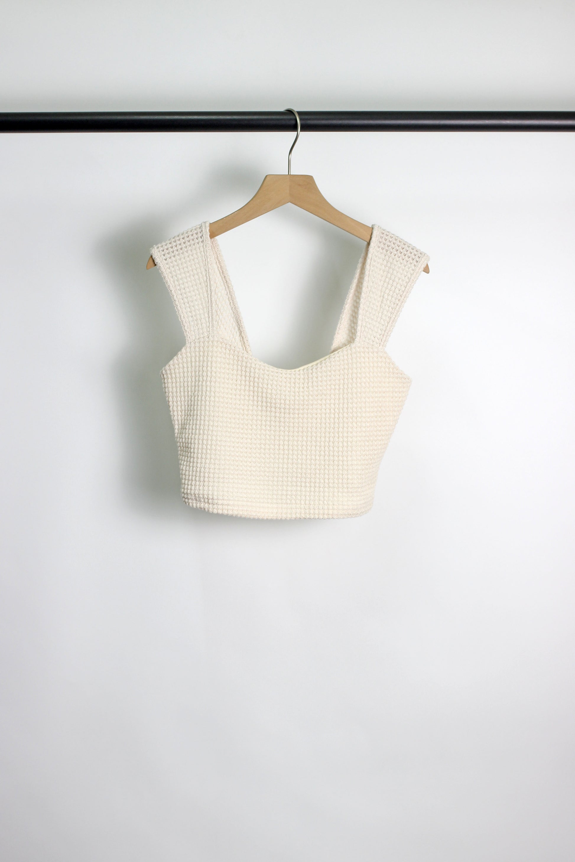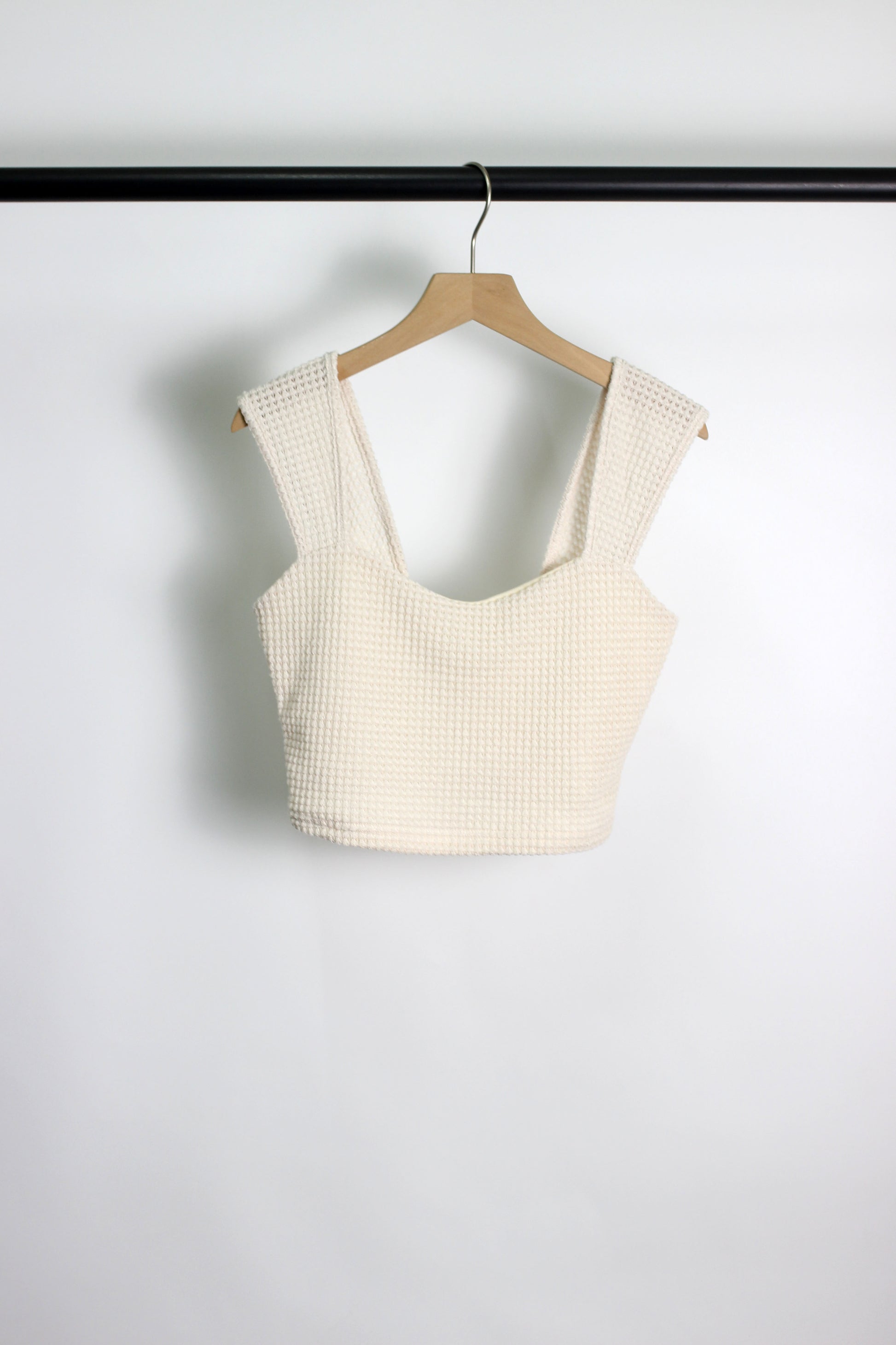 This waffle knit crop top is a stylish and versatile wardrobe staple, featuring a textured knit fabric that offers a cozy yet breathable feel. Designed with wide shoulder straps and a square neckline, this piece delivers a structured yet feminine silhouette. The fitted design enhances the body's natural curves, making it perfect for casual outings, layering, or transitional seasons. With its soft, neutral tones, this top pairs effortlessly with denim, skirts, or wide-leg trousers for an effortlessly chic look.