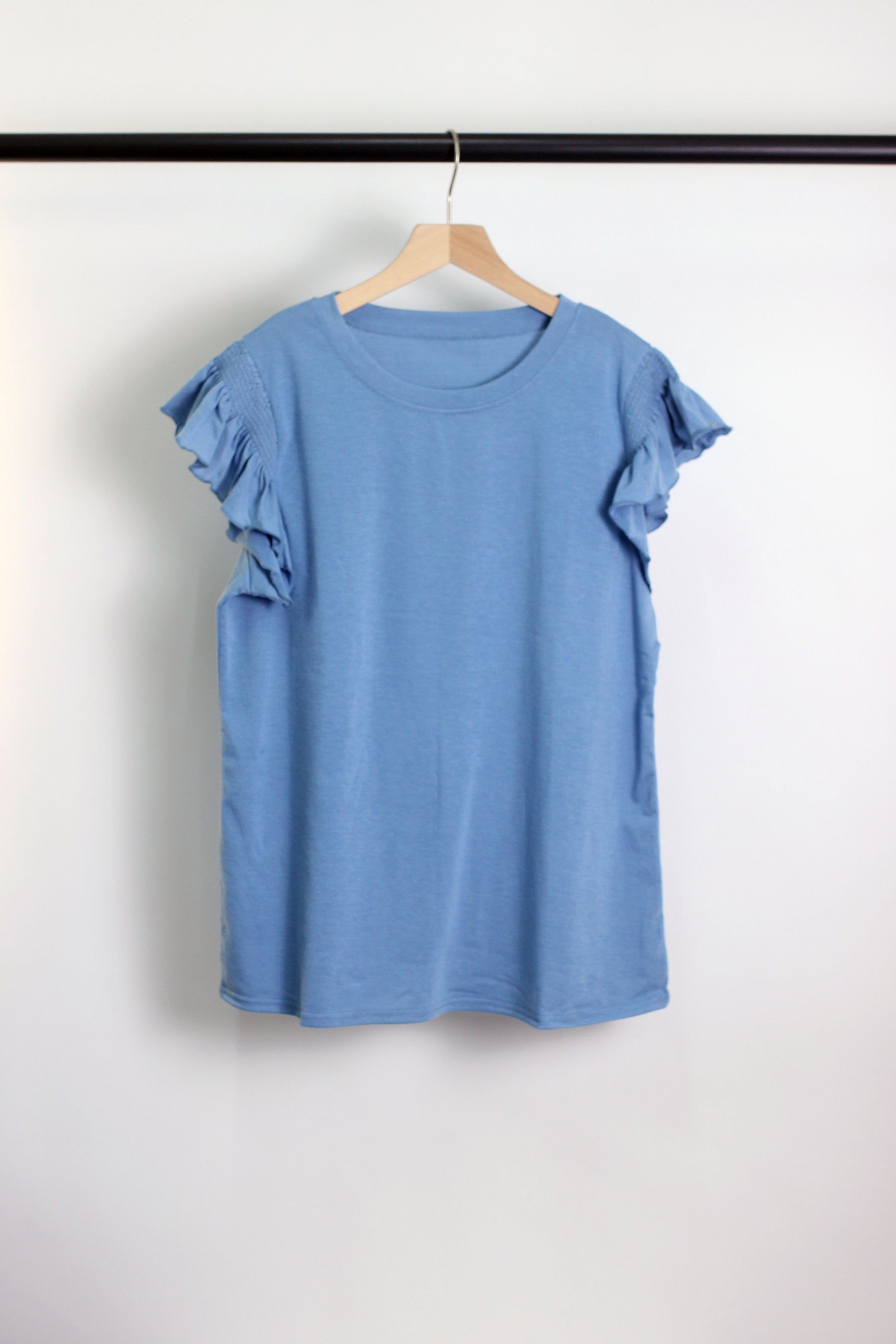 This stylish and comfortable women?¡¥s ruffle sleeve t-shirt is crafted from soft and breathable fabric, making it an essential casual wear piece. Featuring chic ruffled sleeves, a classic round neckline, and a relaxed fit, this tee offers a feminine and trendy look. Available in multiple colors, it is versatile and perfect for daily wear, work, or casual outings.