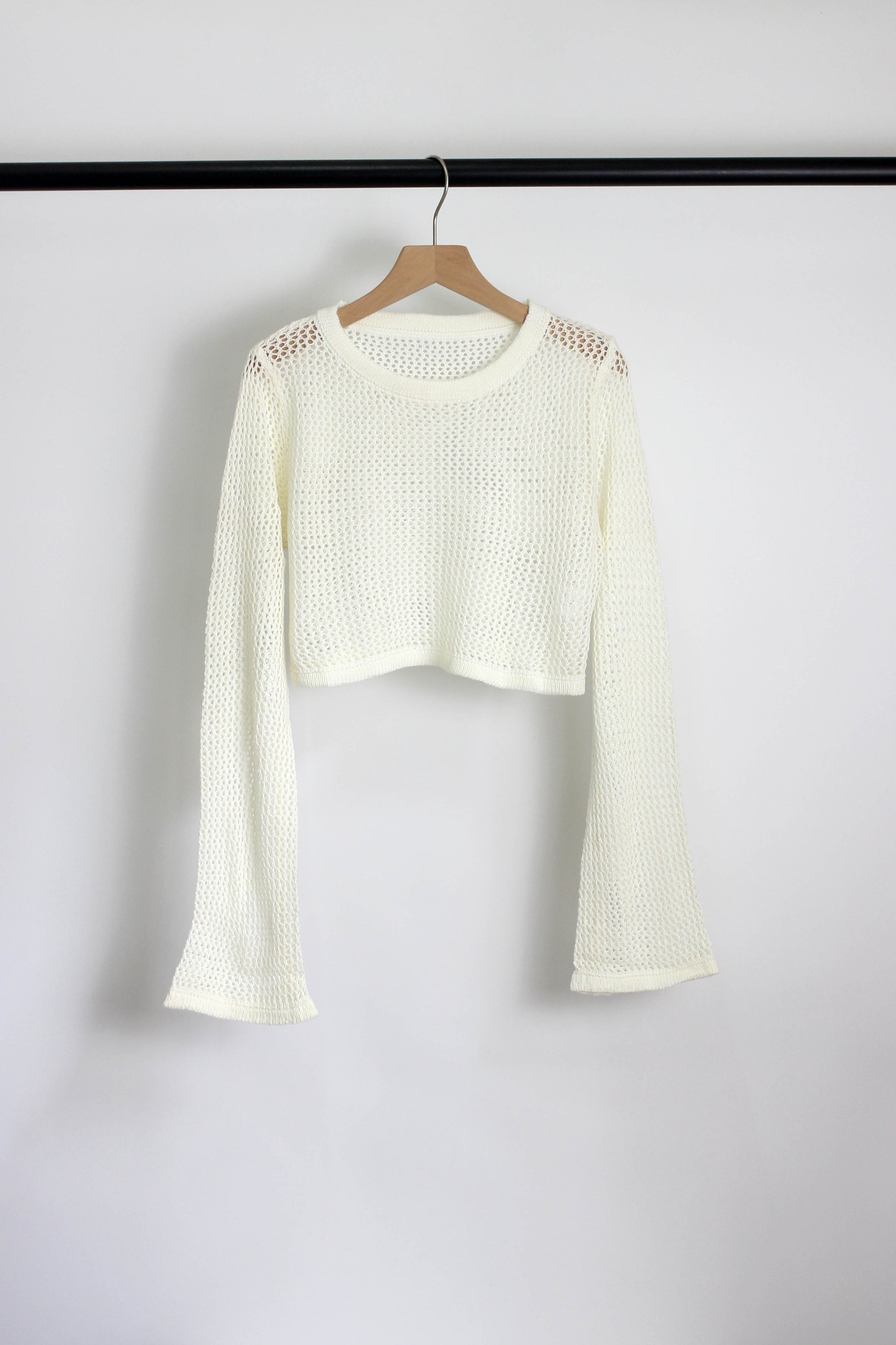Stay effortlessly chic with this off-white crochet knit crop top. Featuring a breathable mesh design, long flared sleeves, and a classic round neckline, this lightweight piece is perfect for layering over tanks or pairing with high-waisted bottoms. Made from soft, stretchable yarn, it?¡¥s ideal for spring and summer styling.