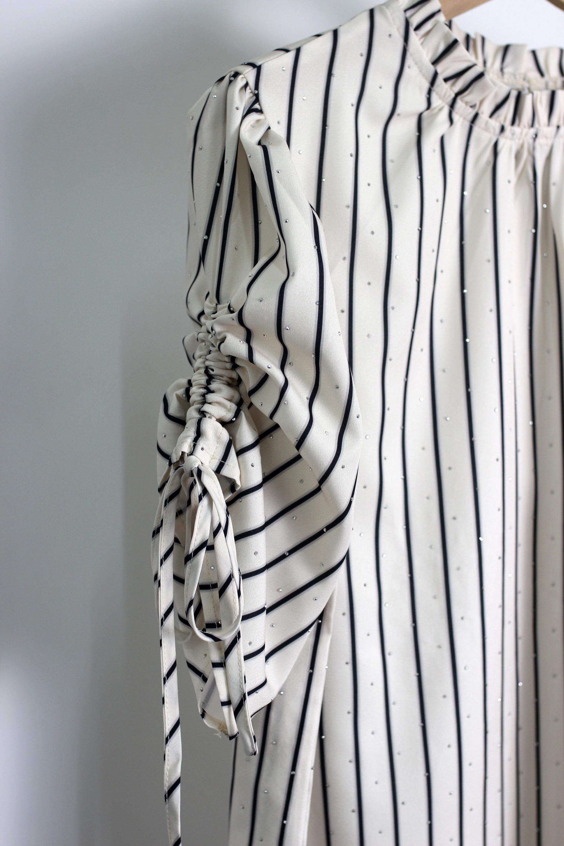 Elevate your wardrobe with this elegant striped blouse featuring subtle rhinestone embellishments and stylish drawstring ruched sleeves. The ivory base is contrasted with classic black vertical stripes, offering a timeless, slimming silhouette. Designed with a gathered round neckline and relaxed fit, this?top is perfect for both casual and semi-formal wear.