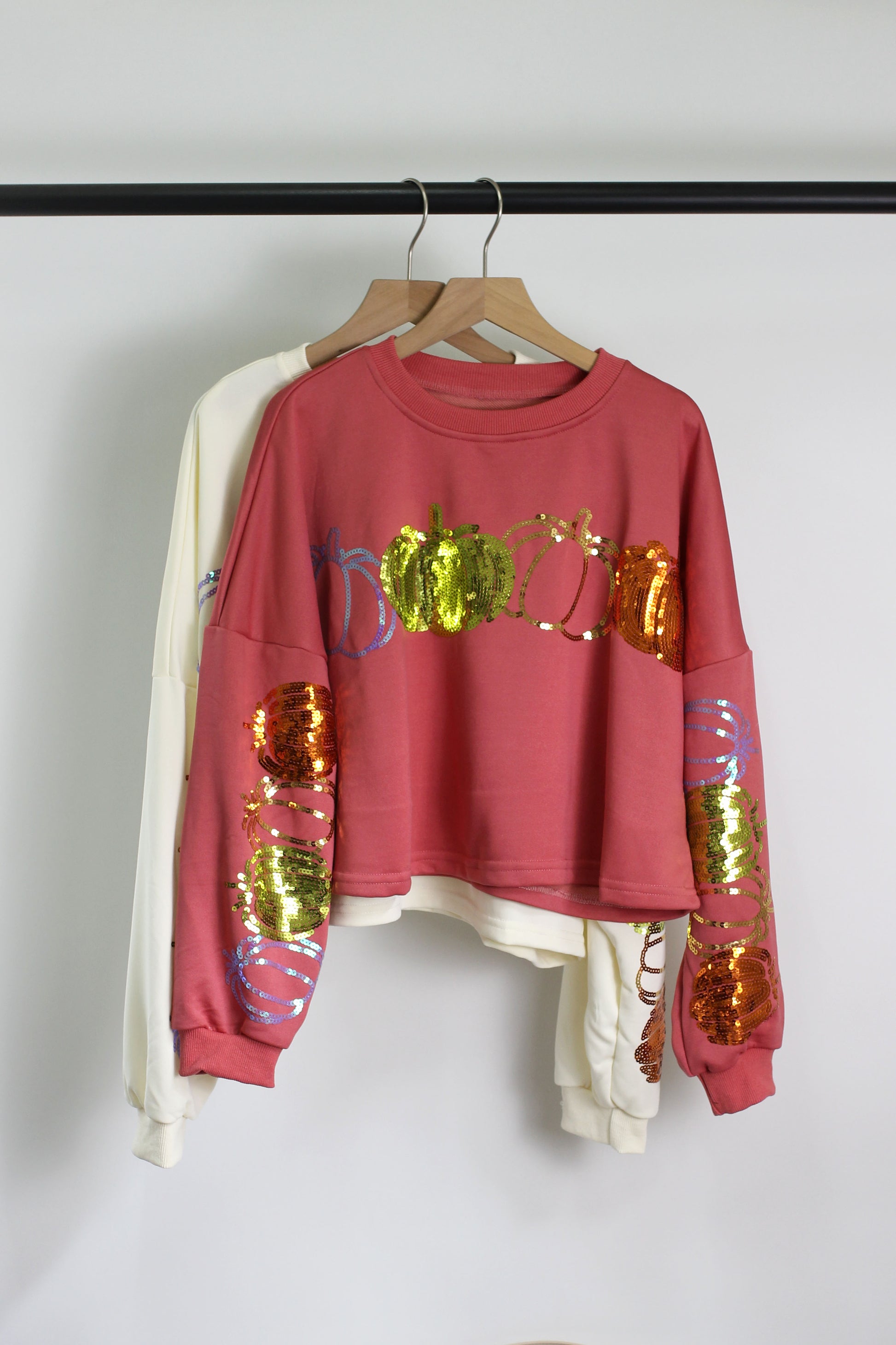 Add sparkle to your fall wardrobe with this cozy and festive sequin pumpkin graphic sweatshirt. Available in dusty pink and cream white, this relaxed-fit pullover features dazzling multicolor sequin pumpkins across the chest and sleeves ¡ª perfect for celebrating the autumn season in style. Made from soft, breathable fabric with a drop-shoulder design, it¡¯s great for casual wear, pumpkin patch visits, or cozy nights in.