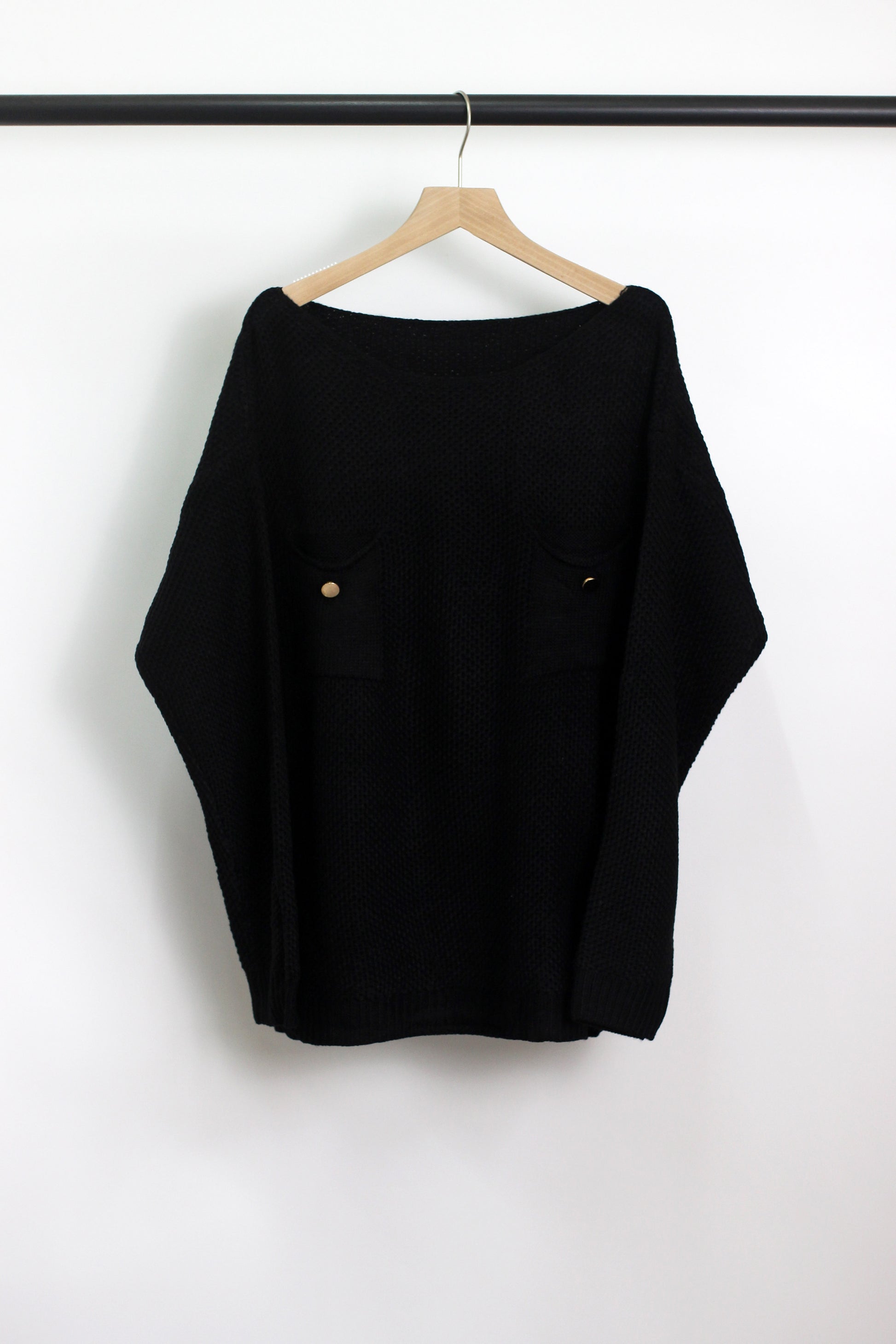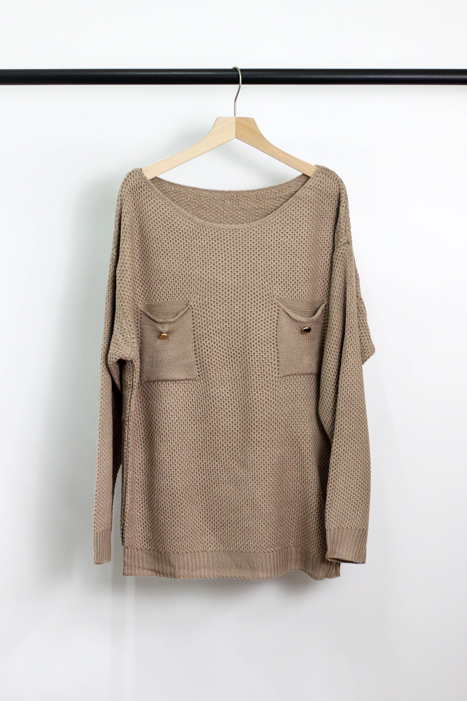 This Textured Acrylic Sweater features a soft, classic basic color and is crafted from a comfortable acrylic material. The design includes a unique textured pattern throughout, adding visual interest and depth. It also features a casual crew neck and two functional patch pockets at the front, adorned with button closures. The relaxed fit and ribbed cuffs and hem provide a cozy and snug feel, making it a perfect choice for casual wear during cooler seasons.