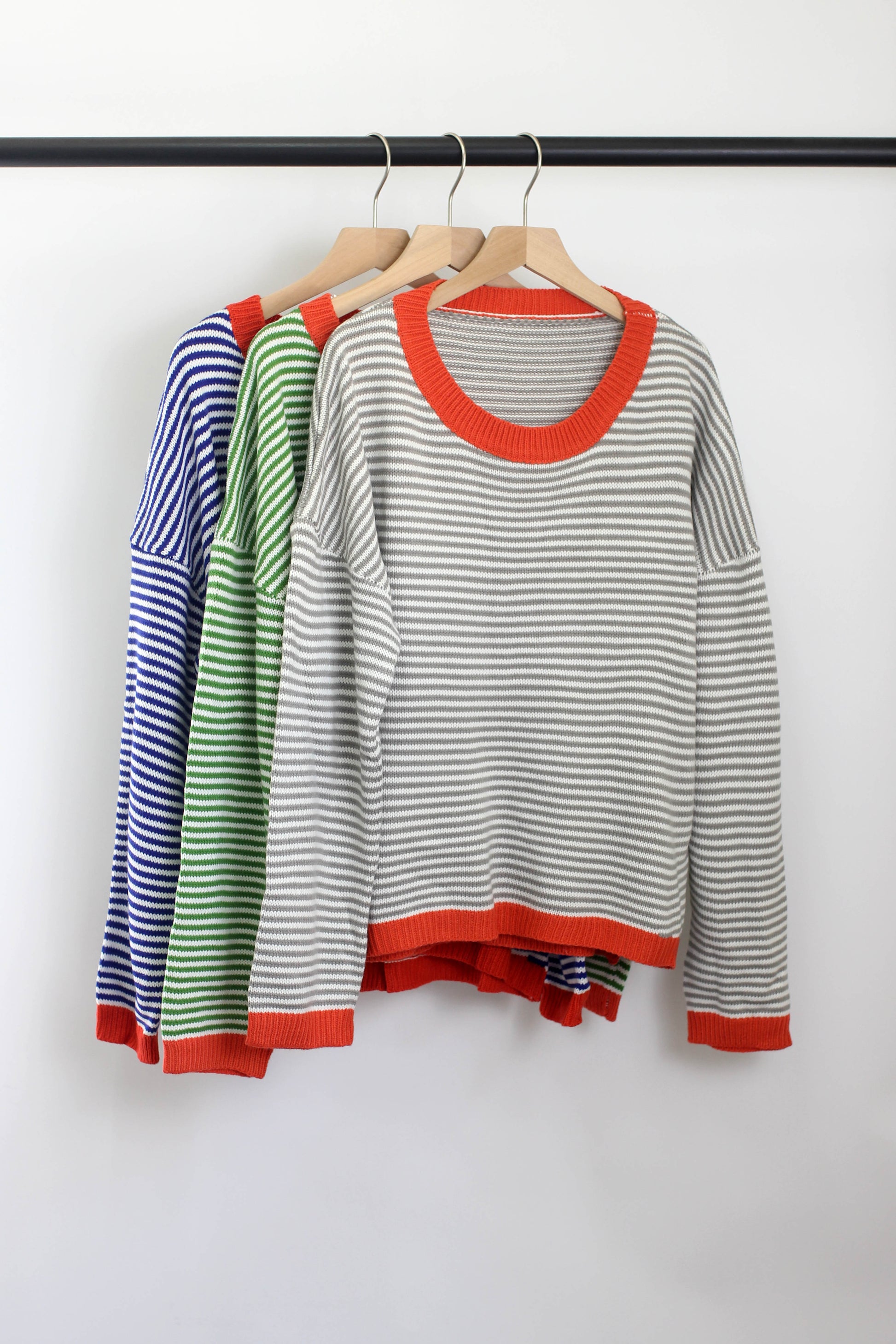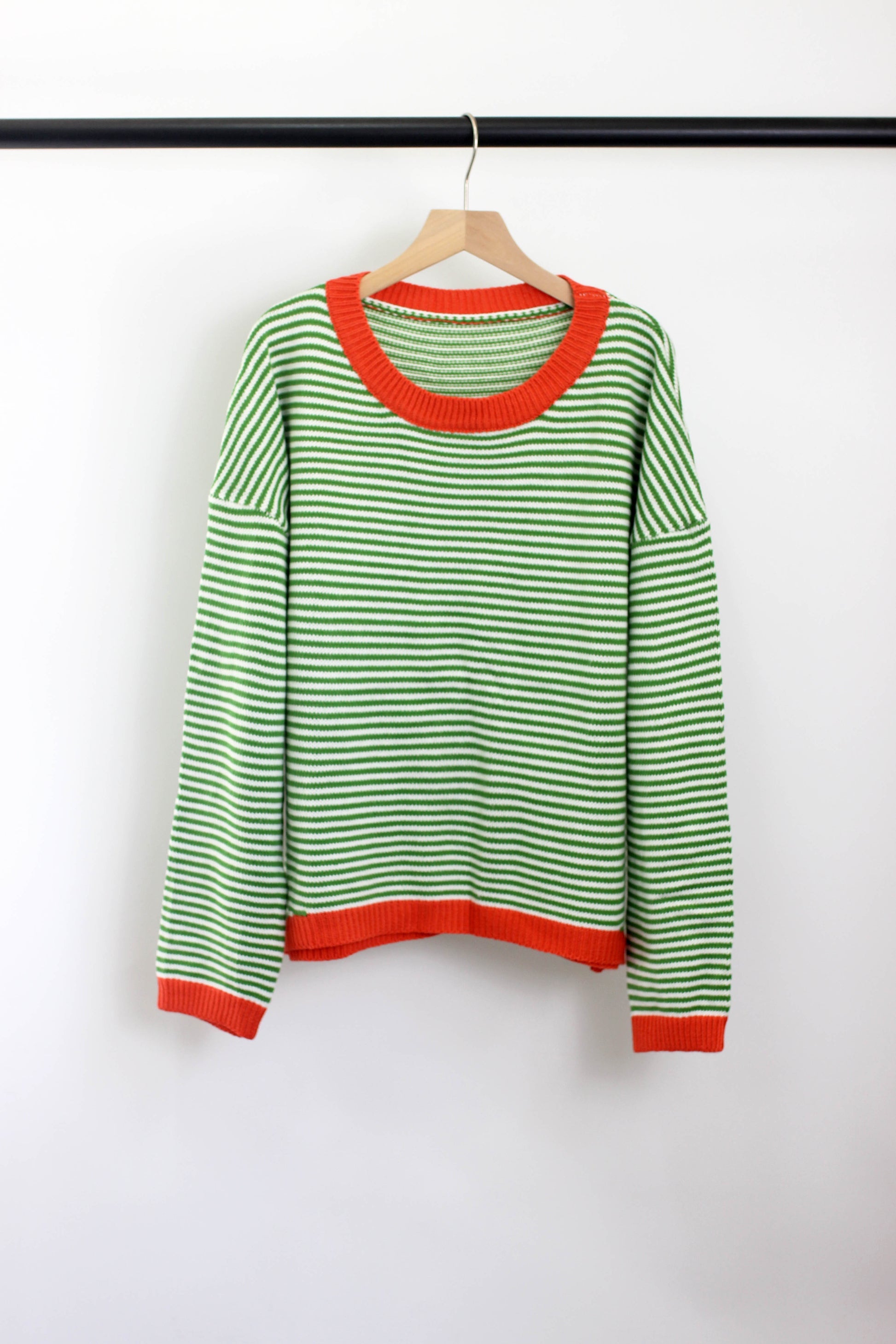This women's striped sweater features a ribbed knit design and contrast trim on the neckline, cuffs, and hem. The relaxed fit provides comfort, while the crew neckline adds a classic touch. Ideal for layering or wearing as a statement piece, this versatile sweater offers both style and warmth for casual outings or cozy indoor settings.