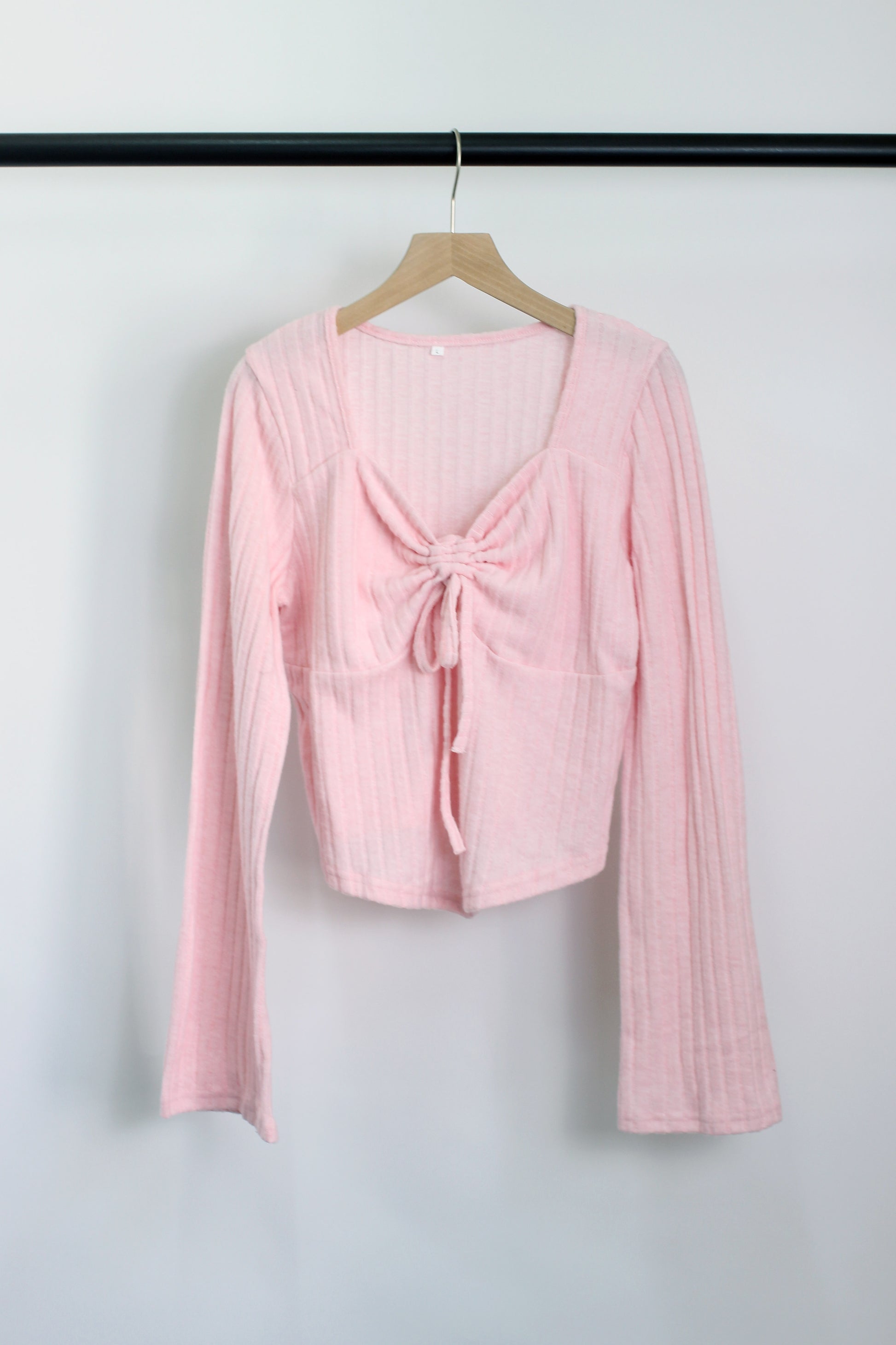 This sweater is crafted from a soft, ribbed knit fabric, featuring a unique tie-front design that accentuates the waistline. The deep V-neckline enhances its feminine allure, making it a perfect blend of comfort and style. The long sleeves and fitted silhouette make it versatile for both casual and semi-formal occasions. Short body length.