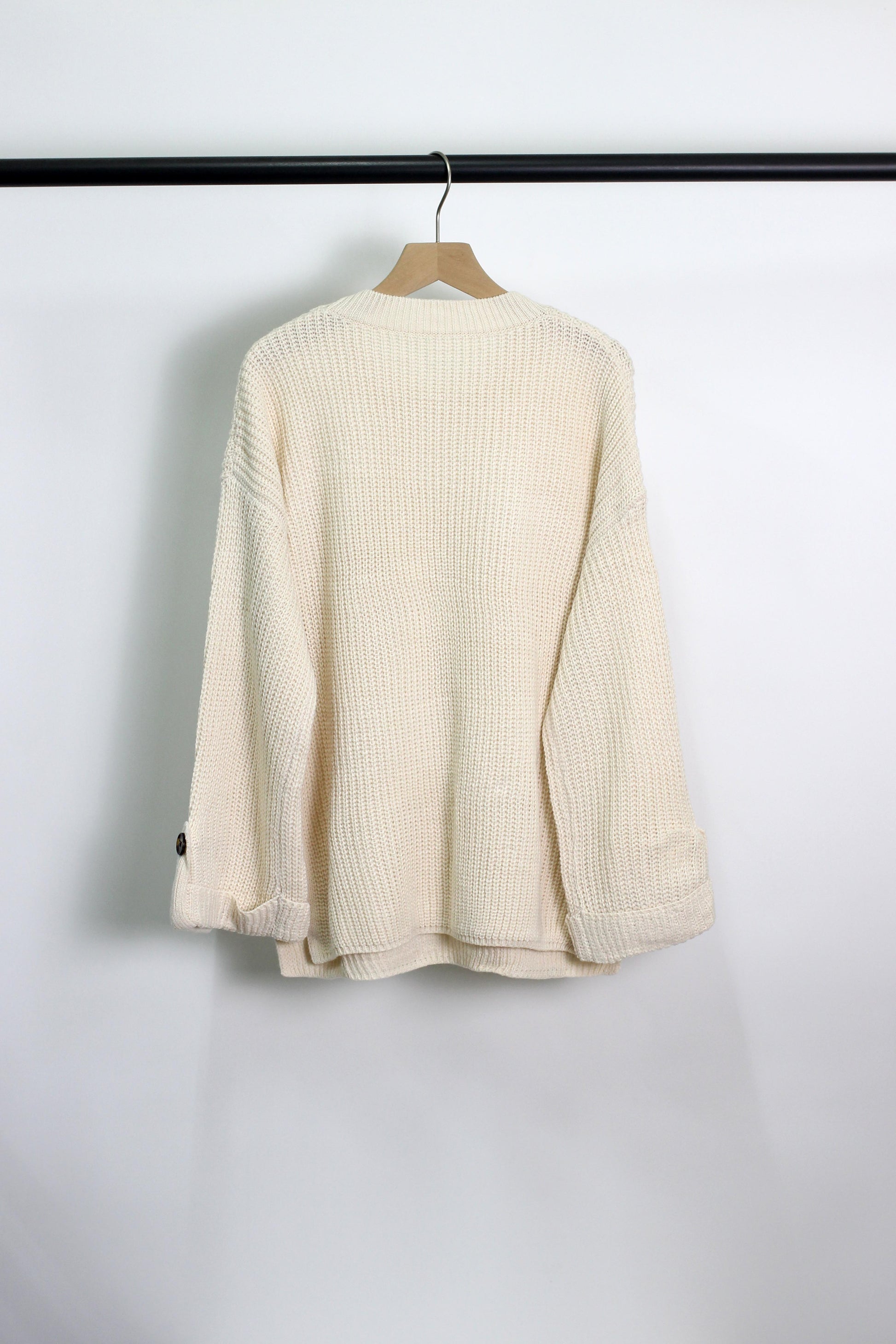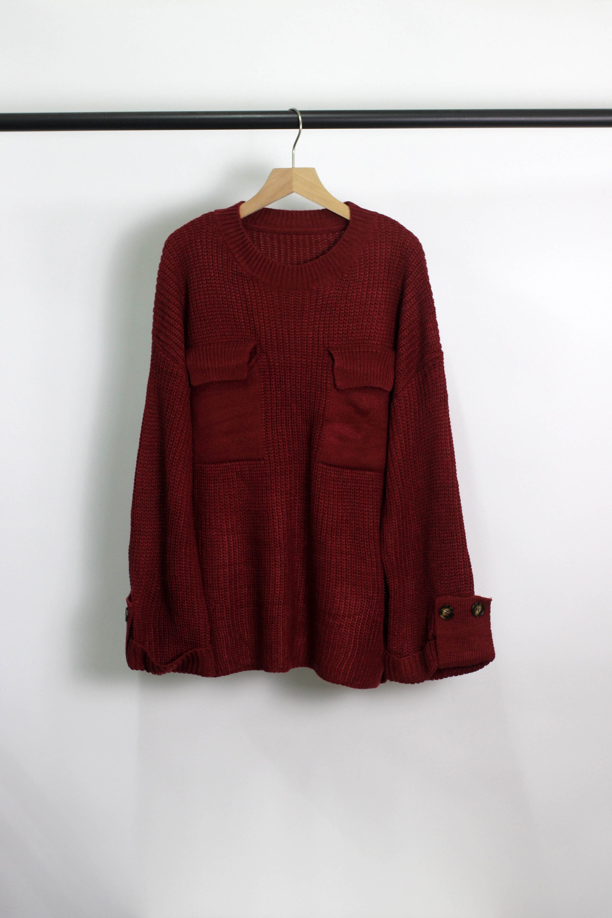 Stay cozy and stylish with this chunky knit sweater for women, featuring buttoned cuffs, dual front flap pockets, and a relaxed silhouette that suits both casual and chic outfits. The ribbed texture and round neckline add a touch of elegance to this soft, warm pullover, perfect for fall and winter layering. Available in multiple colors including cream, white, burgundy, and black, this versatile knit top is ideal for pairing with jeans, leggings, or skirts for an effortless, laid-back look.