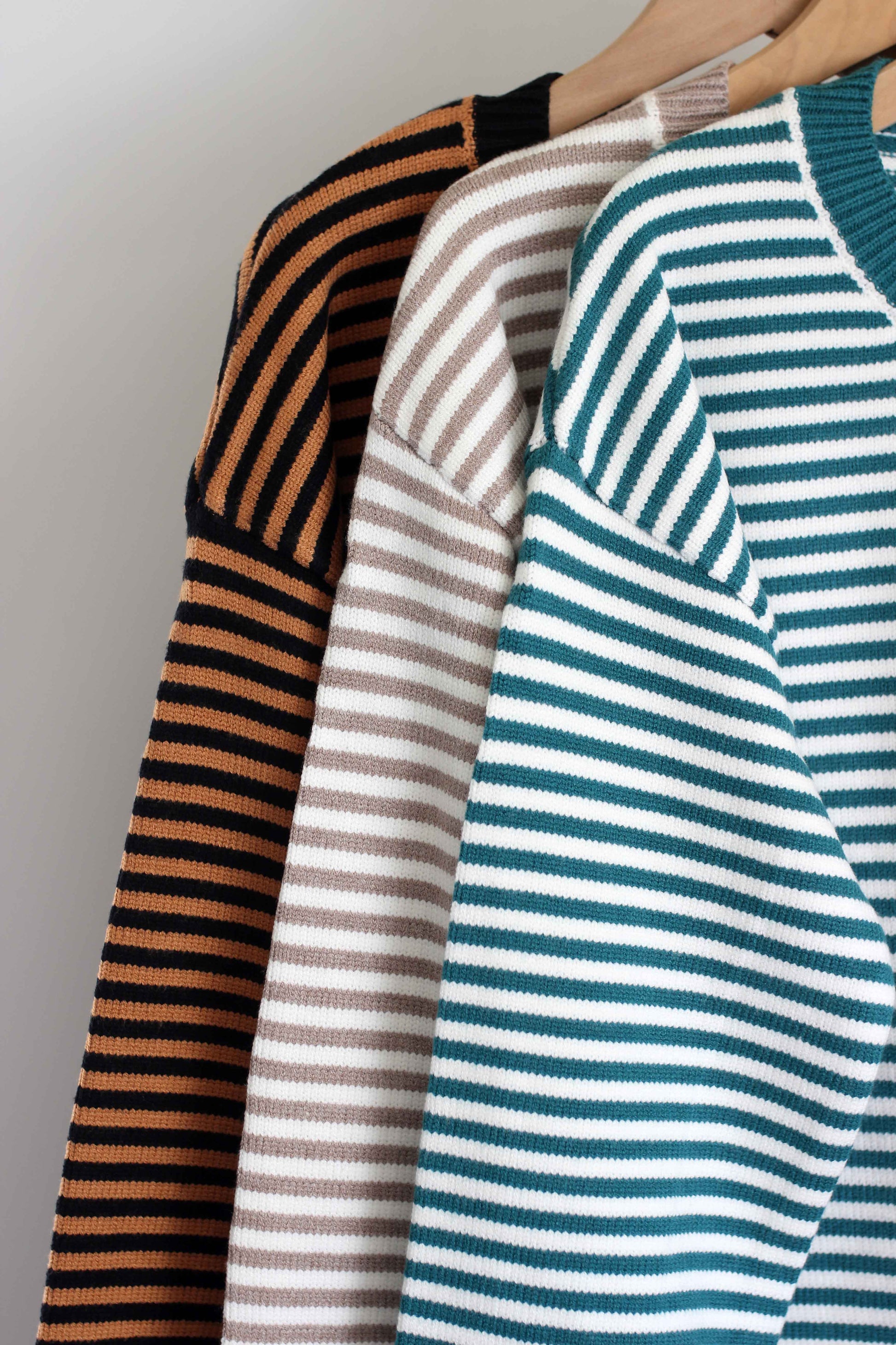 Stay cozy and stylish with this classic striped knit pullover sweater, crafted in a soft, breathable cotton-blend fabric. Featuring a crew neckline, long sleeves, and contrasting ribbed hems, this sweater delivers a relaxed, everyday fit perfect for layering or wearing solo. Available in teal?, beige, and?brown stripe patterns, it's a versatile wardrobe essential for casual wear, fall fashion, or layered winter looks. The timeless horizontal stripe design and modern color palette make it ideal for minimalist styling, cozy chic, or streetwear aesthetics.