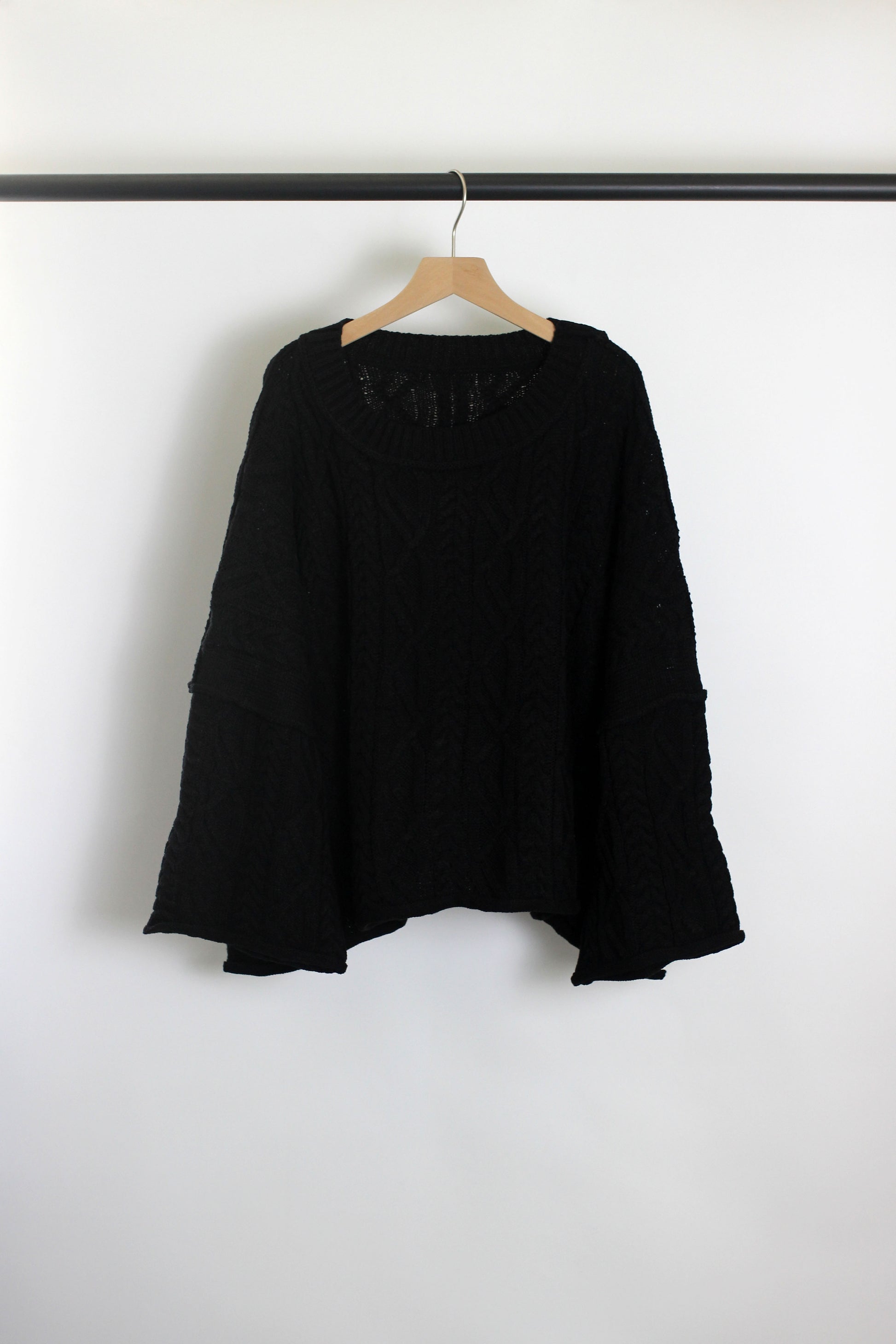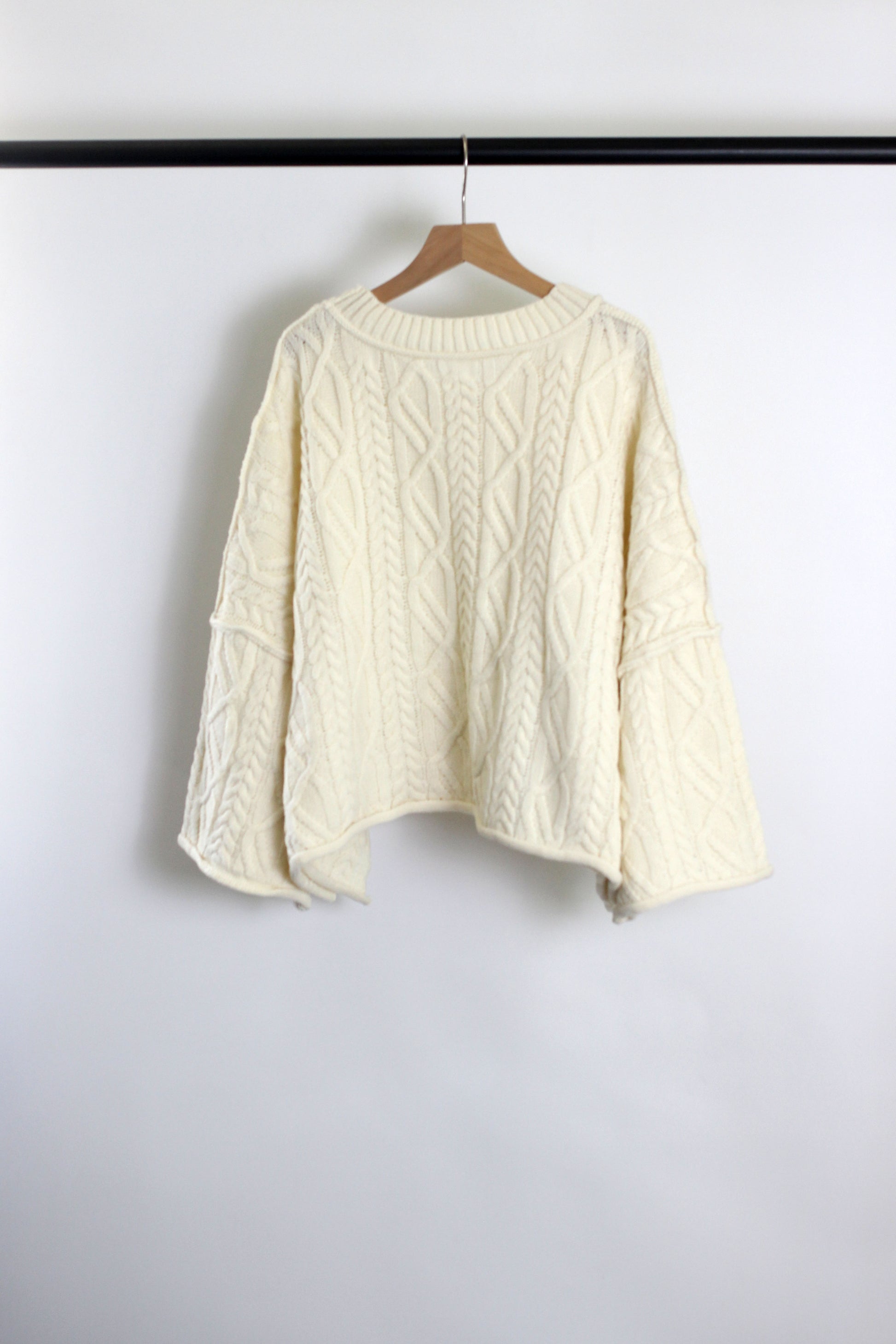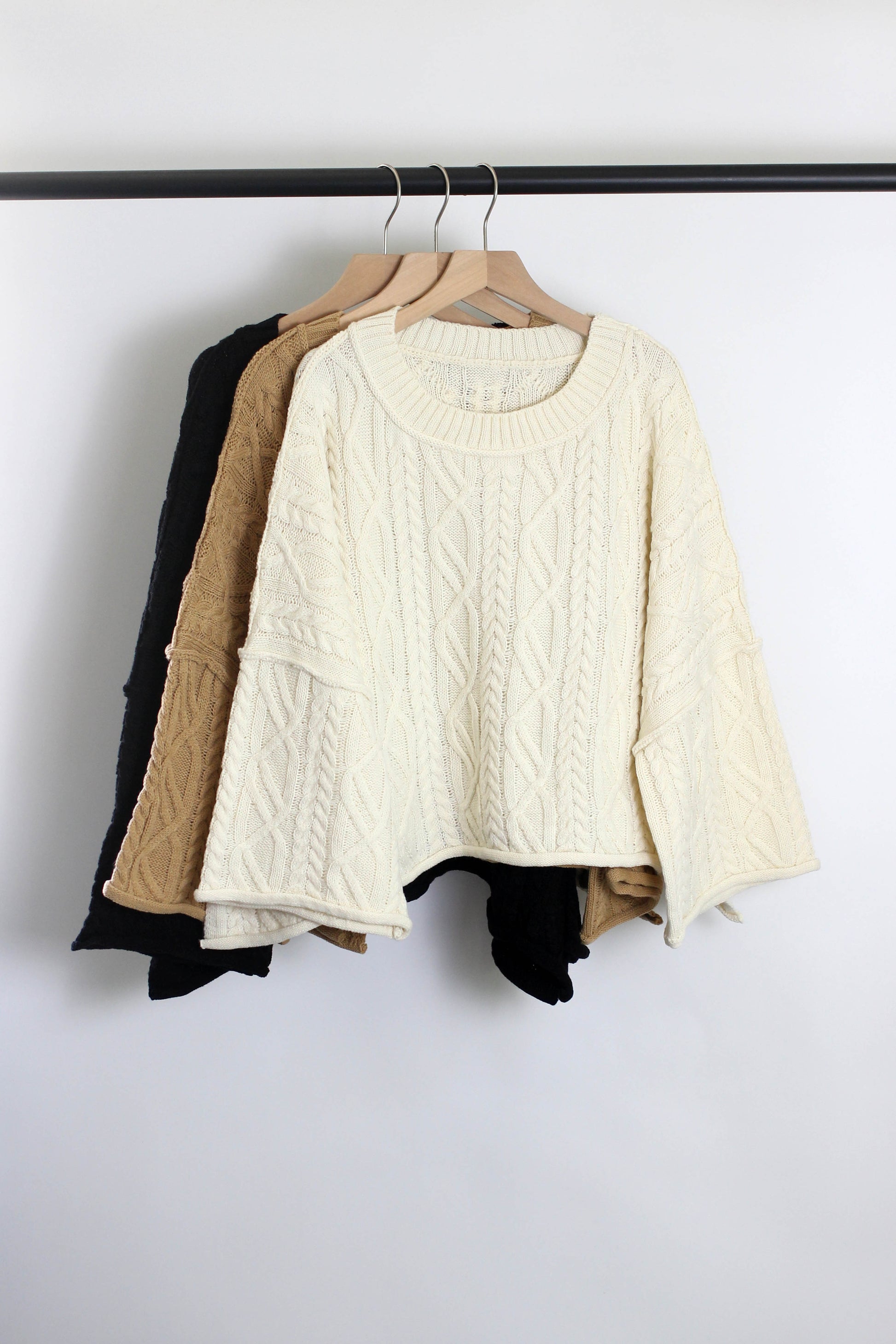 Cozy up in timeless style with this chunky cable knit sweater featuring a classic round neckline and wide bell sleeves. Crafted with intricate textured cable patterns, this oversized pullover delivers both warmth and elegance. Its relaxed, boxy fit offers effortless layering, making it the perfect staple for your fall and winter wardrobe. Available in neutral tones including?cream, camel , and black, it pairs easily with jeans, leggings, or skirts for a chic and comfortable everyday look.