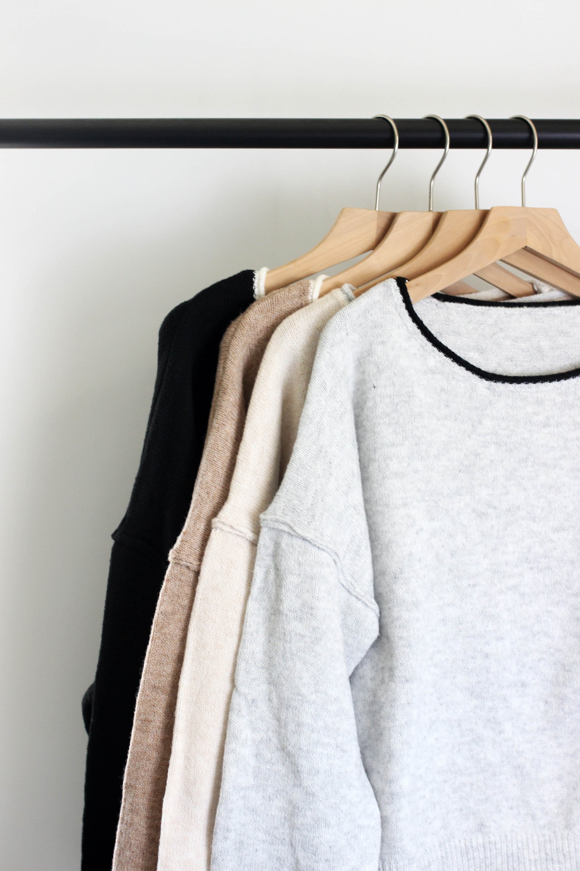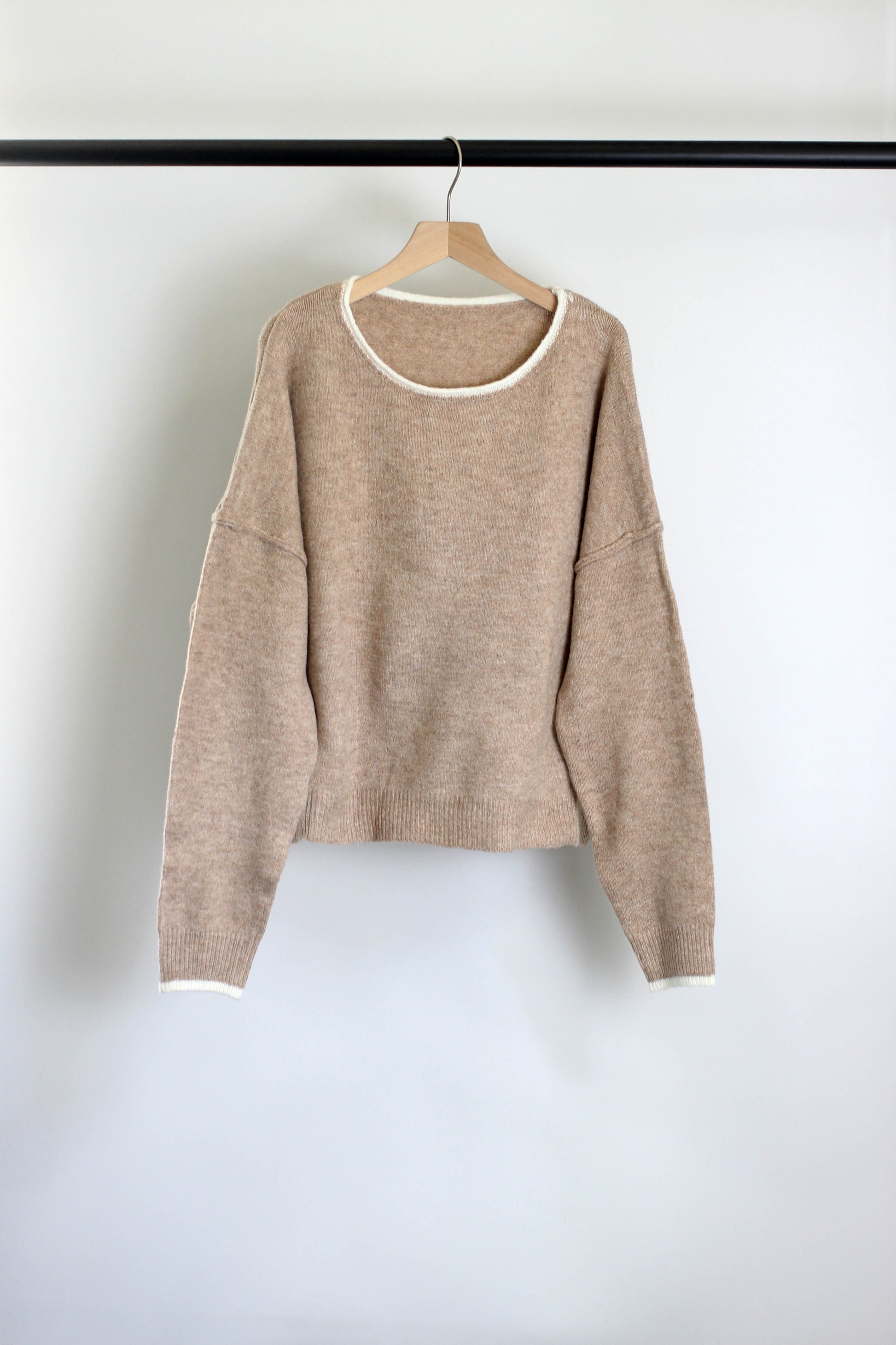 Stay cozy and stylish with our Contrast Trim Soft Knit Pullover Sweater, crafted from a plush, mid-weight knit for ultimate comfort. Featuring a relaxed drop-shoulder fit, this crew neck sweater is accented with a clean contrast trim along the neckline and cuffs, adding a modern touch to its minimalist design. Available in neutral tones like beige, khaki, grey, and black, this?versatile layering piece pairs effortlessly with denim, skirts, or trousers for a laid-back yet elevated look.